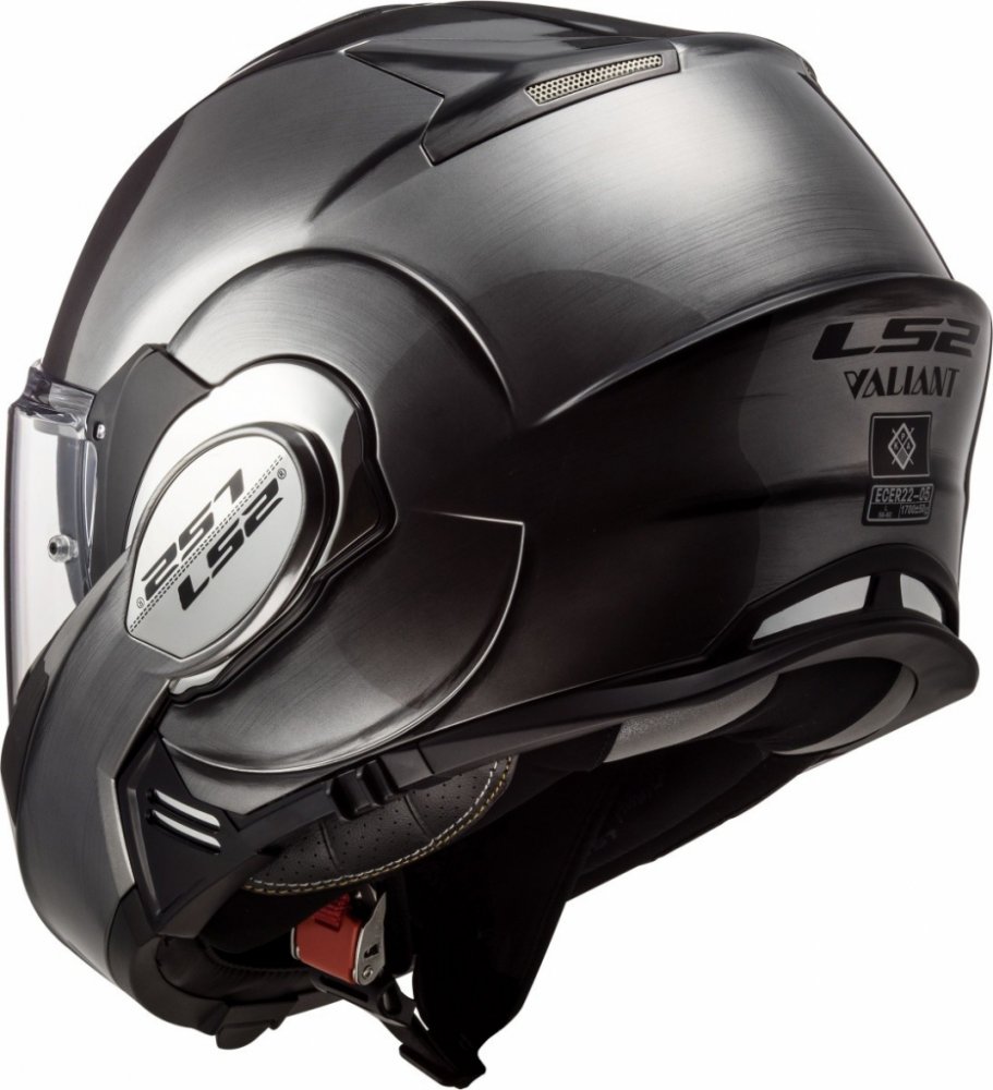 Překlápěcí přilba Valiant s promyšleným mechanismem překlápění a integrovanou sluneční clonou přináší líbivý avantgardní design a všechny výhody integrálních a otevřených helem v jednom modelu. Bradovou část lze i s plexi jediným pohybem překlopit úplně dozadu, a z plnohodnotné integrální helmy se Valiant během chvilky změní ve vzdušnou otevřenou přilbu s nízkým aerodynamickým odporem.