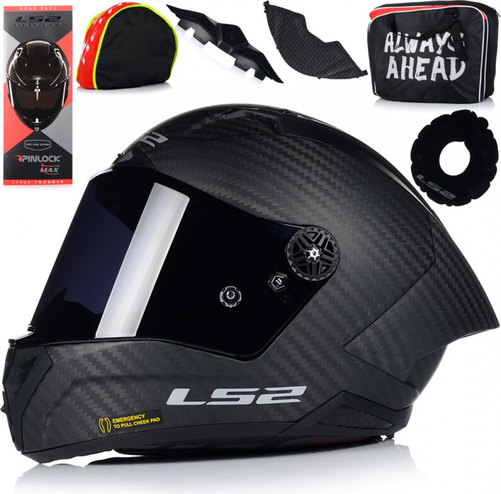 Karbonová integrální motocyklová helma LS2 Thunder nabízí výkonné funkce za neuvěřitelnou cenu. Jedna z nejpropracovanějších závodních / sportovních helem současnosti. S karbon-aramidovou skořepinou, nejkvalitnějším mechanismem aretace plexi na světě, dvěma plexi v ceně (čirým a tmavým) a antimikrobiálním interiérem s obsahem stříbrného vlákna nabízí přesvědčivé argumenty pro všechny jezdce, kteří hledají kvalitní helmu pro závodění a sportovní ježdění.