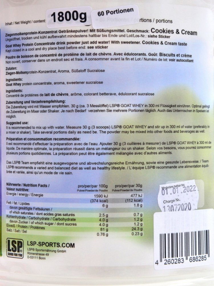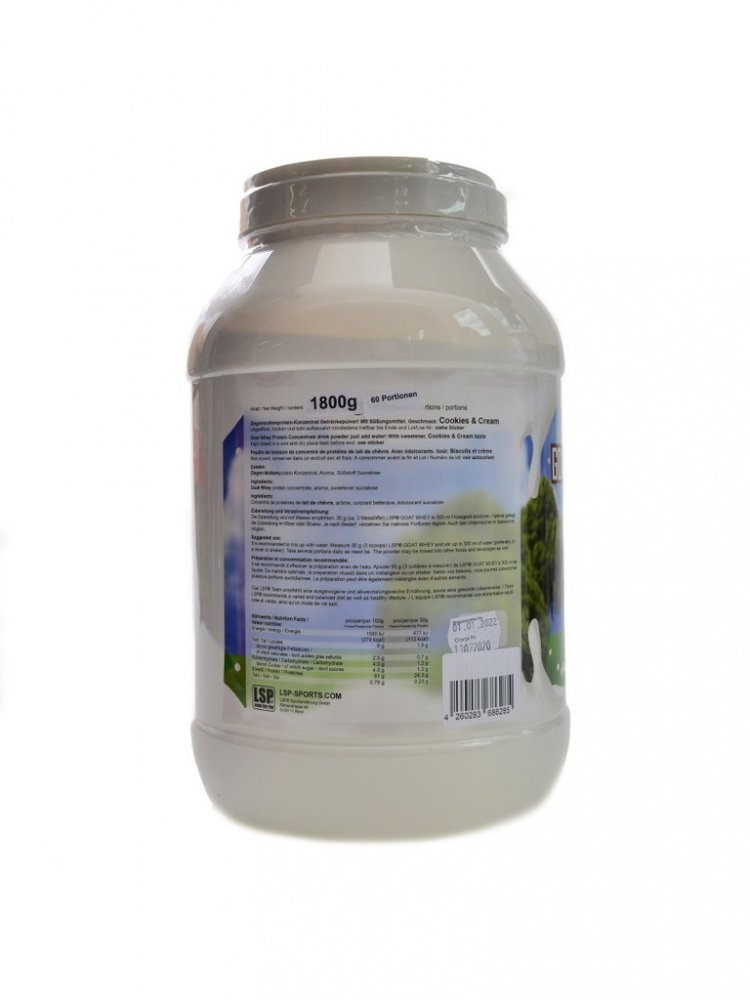 LSP nutrition 1800 g syrovátkové práškové 24.3 g 30.0 g 60 ks 114.0 kcal sukralóza, aroma kozí syrovátka, kakao, sukralóza 10.0 g/100 ml