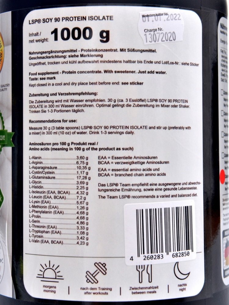 Doporučený denní příjem bílkovin (alespoň 1 až 1,5 g bílkovin na 1 kg hmotnosti) můžete právě doplnit sójovým proteinem. Jedna běžná dávka je 30g a rozpustíte ji v 3dcl vody. Jelikož sójový protein vytváří velmi hustý nápoj, můžete použít více vody. Použijte 1-3x denně. Ideálně 30 min až hodinu po tréninku, případně před spaním. Možno použít i jako denní svačinu.
