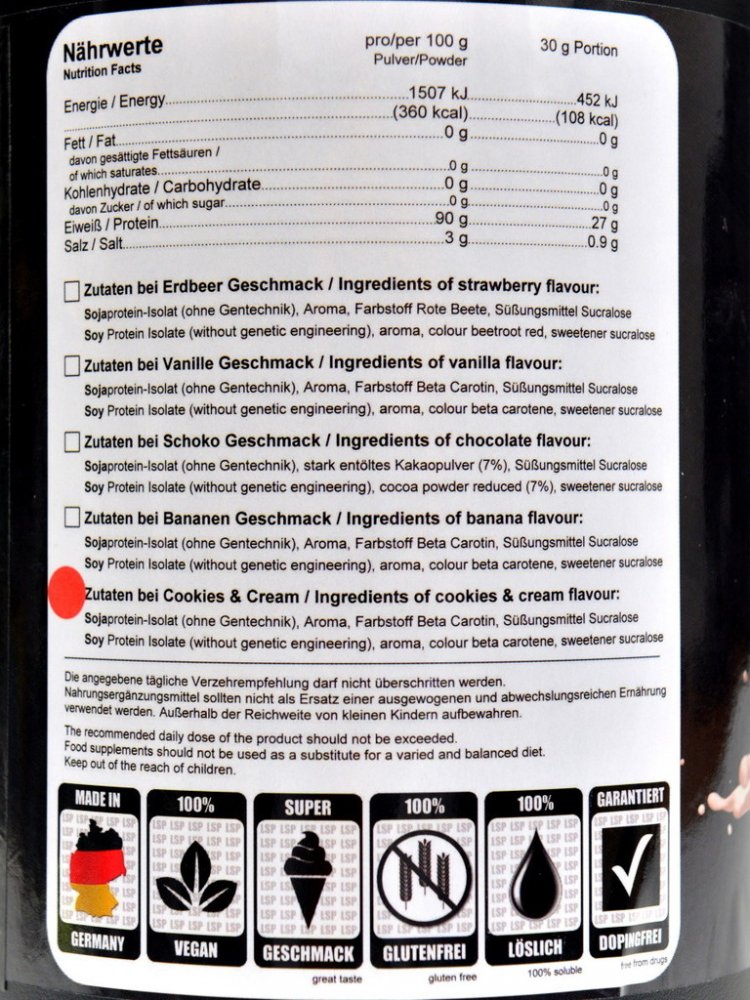 100g výrobku obsahuje 90g bílkovin ze sojového isolátu, uhlohydráty 0, cukry 0, tuk 0, vláknina 0, sodík 1,2g, soja proteinový Isolát bez GMO, sladidlo sukralóza, podle příchuti přidáno přírodní aroma, případně barviva z přírodních zdrojů, beta karoten, výtažky z červené řepy, nebo kakaový prášek s obsahem 7%.