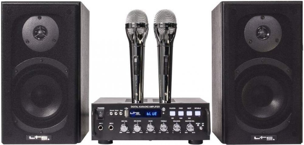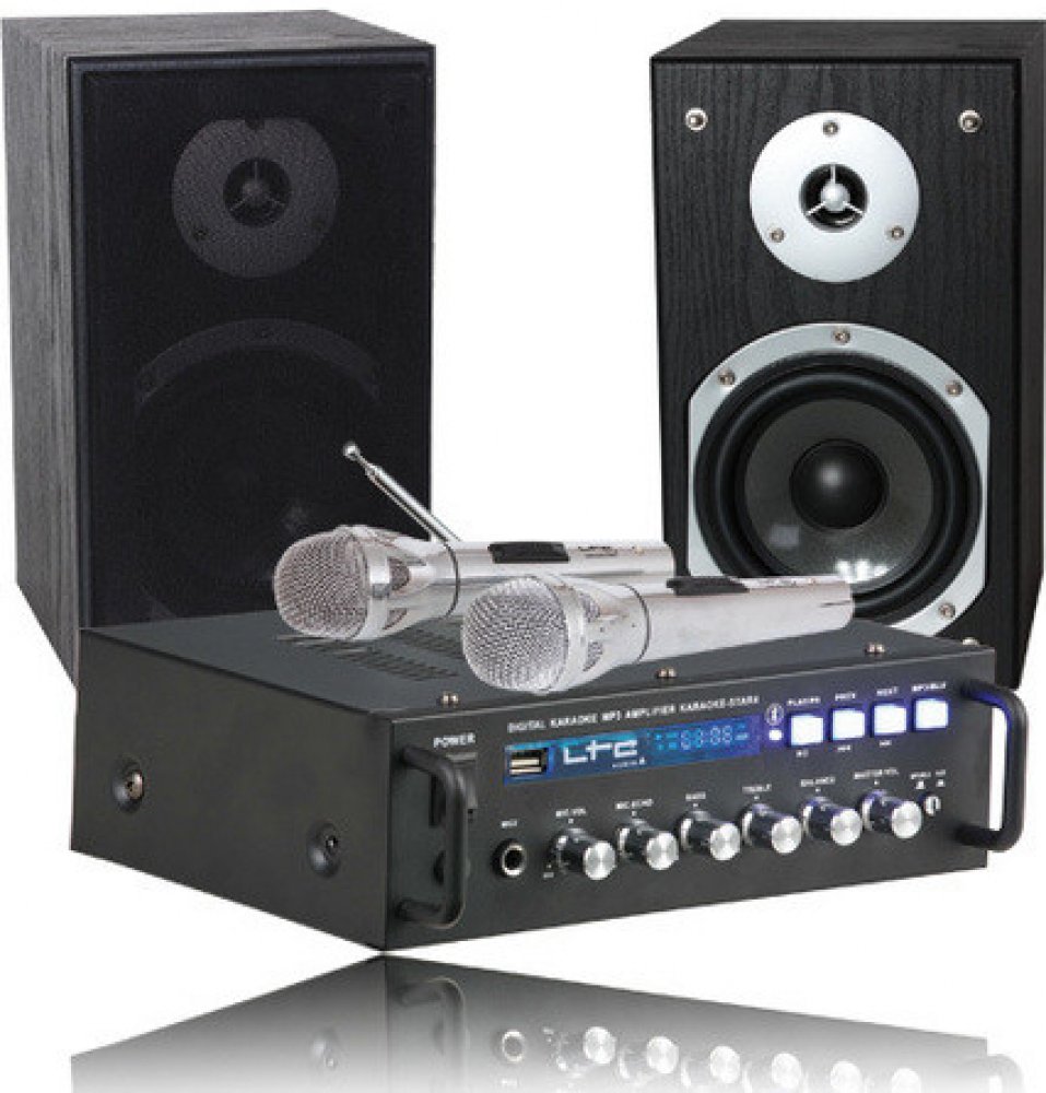 Výkonný karaoke set LTC Audio Karaoke-Star4 MK II v černém provedení se postará o skvělou zábavu na každém večírku či oslavě. Set obsahuje zesilovač se stereo reproduktory s max. výkonem 2× 75 W a dva kabelové mikrofony. Disponuje integrovaným USB portem pro přehrávání hudby z flashdisků a technologií Bluetooth pro bezdrátové streamování skladeb z mobilu či tabletu. Součástí je LED displej, na kterém se zobrazí všechny důležité informace a praktická ovládací tlačítka či otočné knoflíky pro regulaci vyvážení, hlasitosti, výšek a basů.