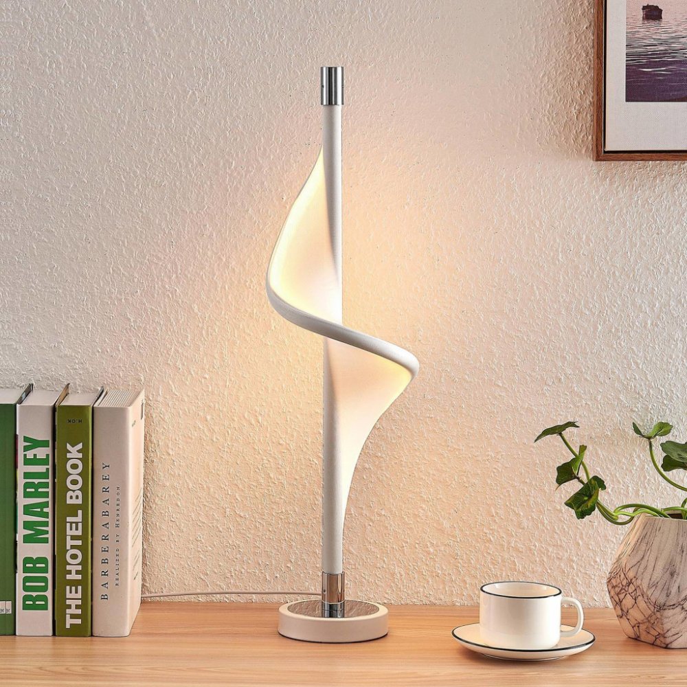 Stolní lampa Edano LED z hliníku působí obzvlášť dekorativně díky bílému látkovému stínítku, které se jako spirála obtáčí kolem stonku stolní lampy - stolní lampa s odlišností. Lampa je vybavena teplými bílými diodami LED, které lze zapínat a vypínat pomocí vypínače integrovaného v kabelu.