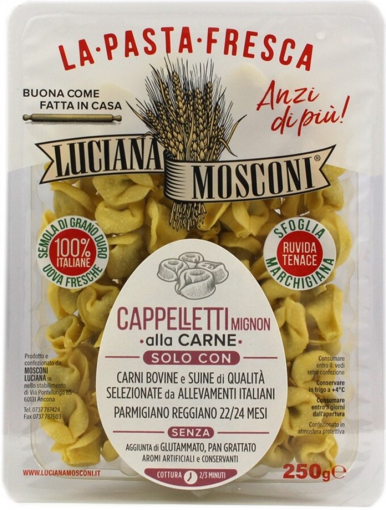 Složení: Těstoviny 62%: krupice z tvrdé pšenice, čerstvá vejce 30%, náplň 38%: hovězí maso 33%, vepřové maso 31%, mortadella (vepřové maso, vepřové dršťky, sůl, sacharóza, přírodní aromata, koření a aromatické rostliny, stabilizátory: polyfosfáty, zvýrazňovače chuti: E621, antioxidanty: E301, konzervanty: E250), Parmigiano Reggiano CHOP (mléko, sůl, syřidlo) 11%, sůl a muškátový oříšek, Může obsahovat stopy sóji, pistácie a hořčice