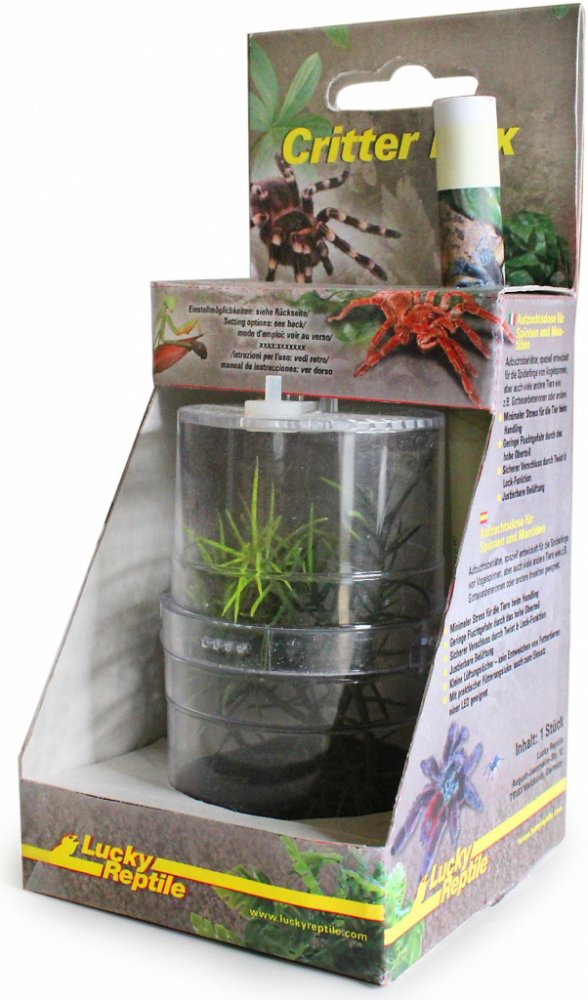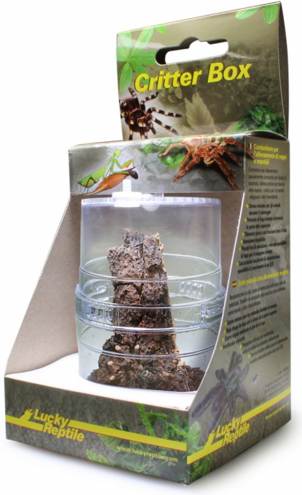 Critter Box je speciálně konstruován pro mláďata a malé druhy pavouků, ale je vhodný také pro mláďata kudlanek a jiných bezobratlých. Critter Box snižuje stres u zvířat, omezuje riziko útěku, má bezpečné uzavírání, nastavitelné boční ventilační otvory a uzavíratelný otvor pro krmení (otvor je vhodný i pro instalaci LED osvětlení).