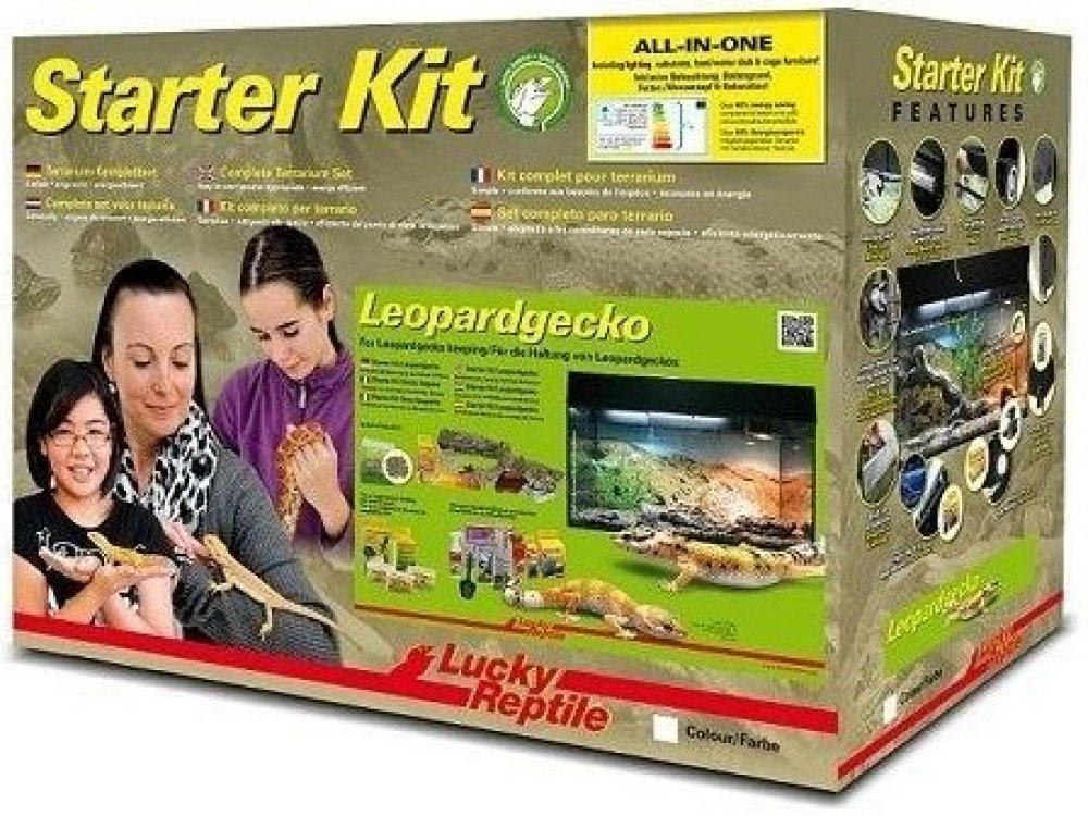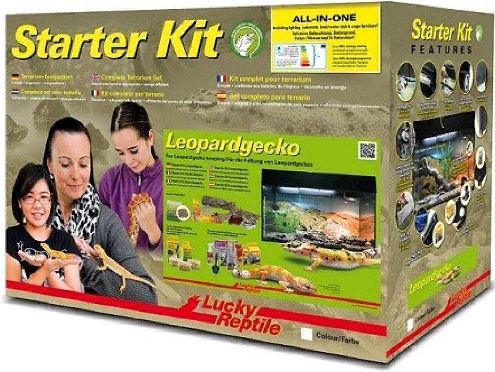 Starter Kit Leopard Gecko je skleněné terárium ve dvou barevných provedeních, černé a bílé. Obsahuje vše, co je třeba pro začátek chovu gekončíků nočních, včetně osvětlení, dekorací, plakátu na pozadí, substrátu a misky na krmení. Součástí balení je brožurka a/nebo DVD v cizím jazyce o chovu gekončíků.