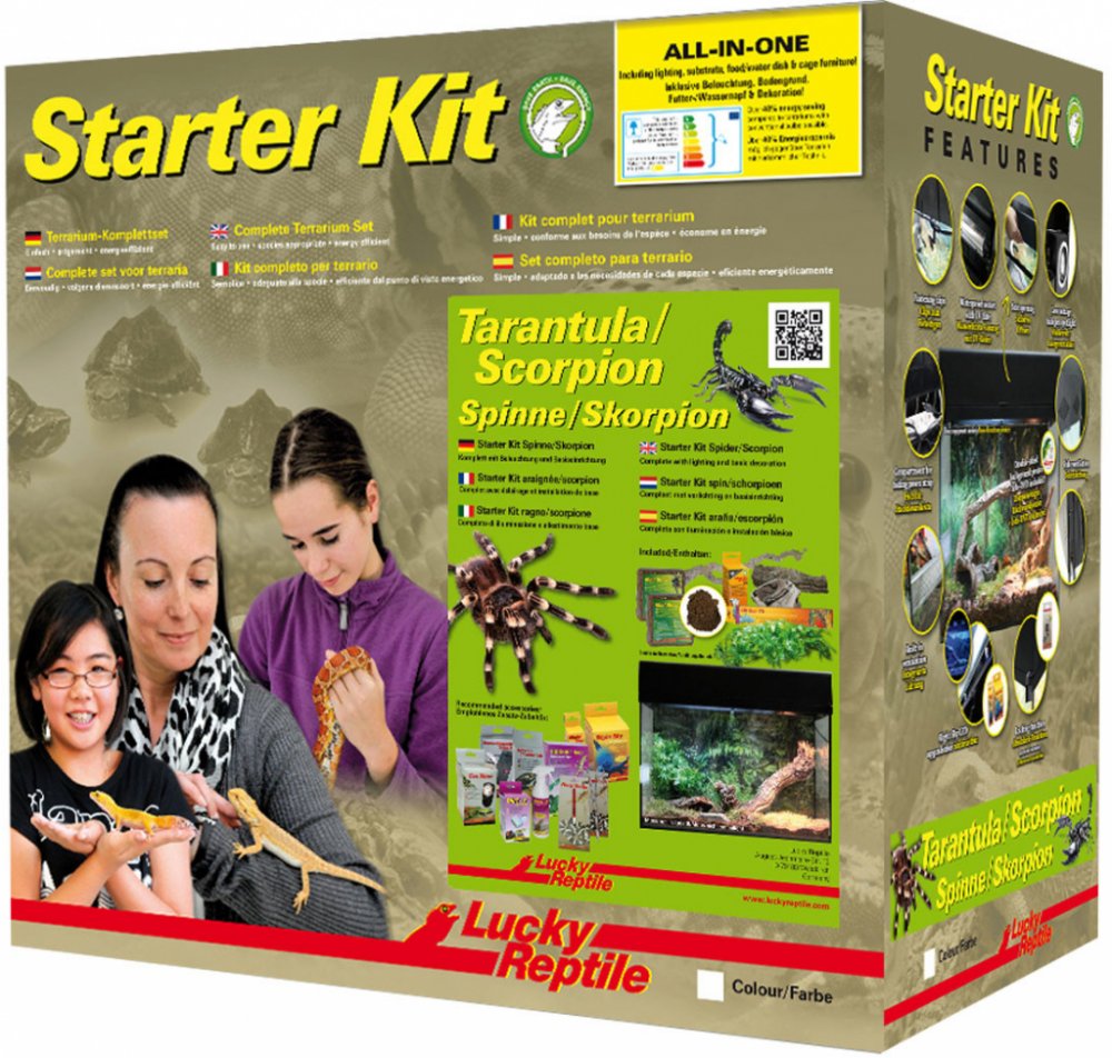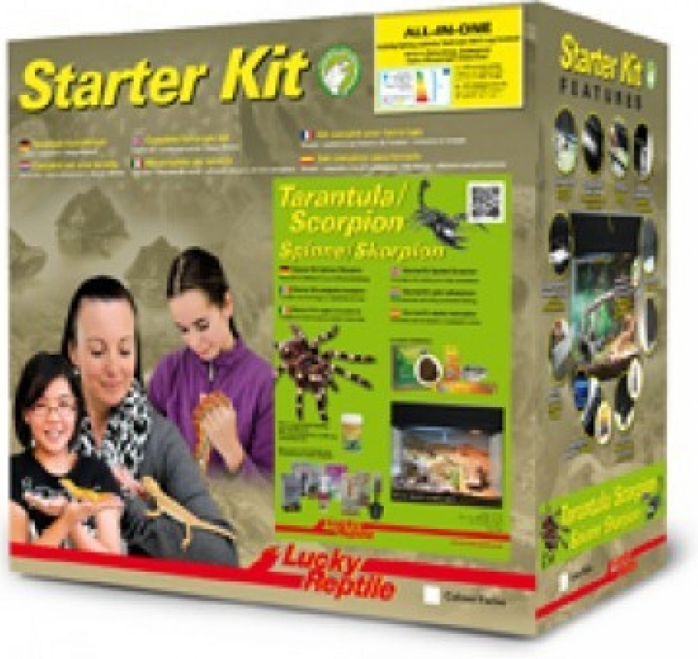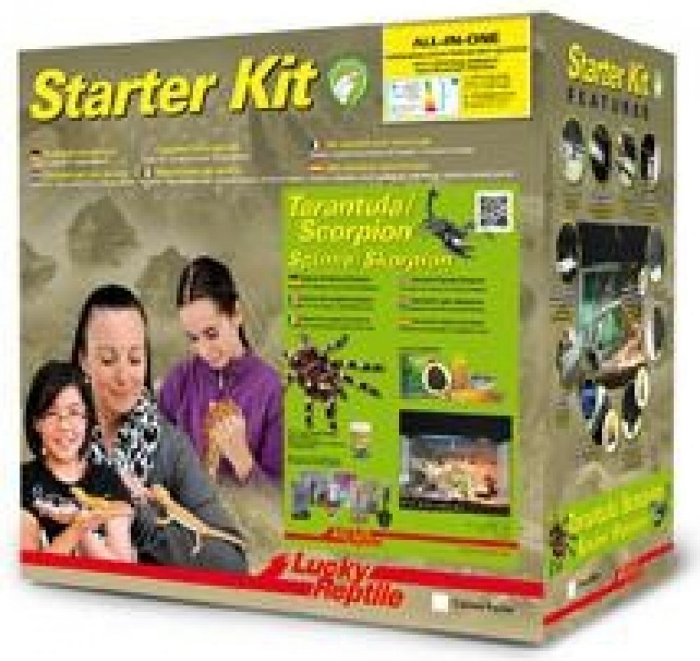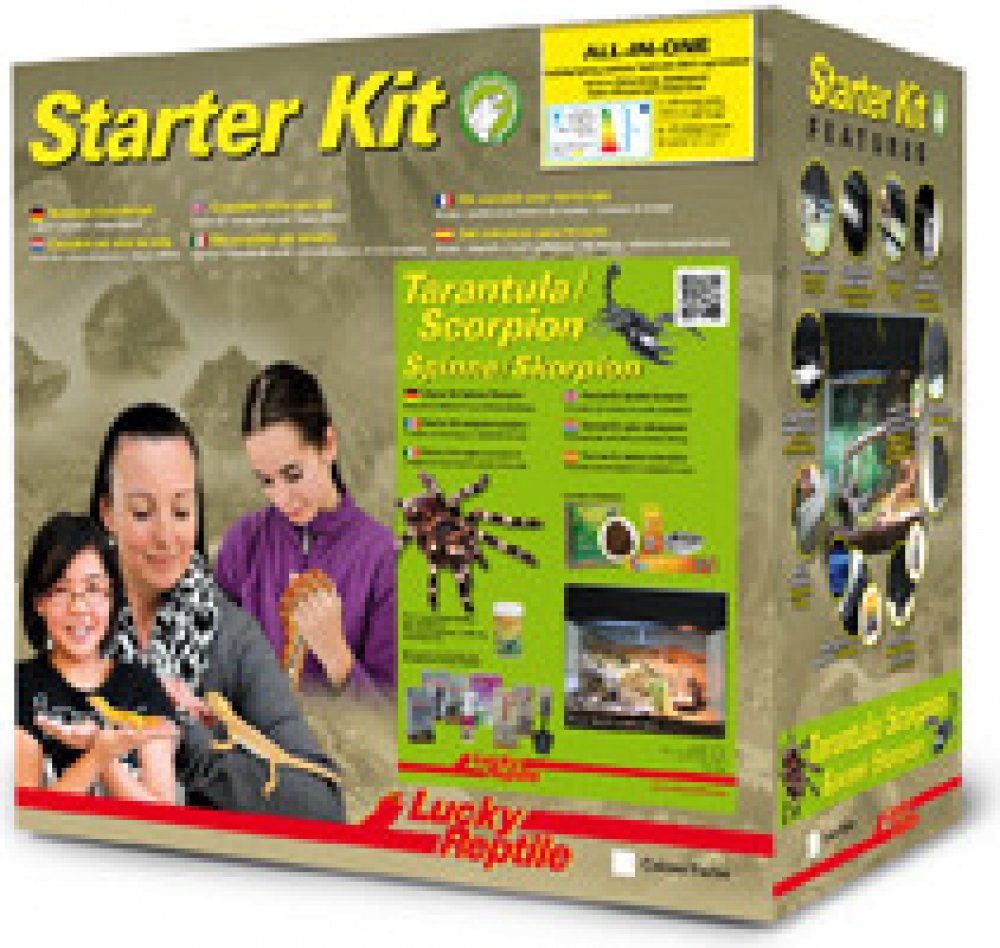 Starter Kit Tarantula+Scorpion je skleněné terárium ve dvou barevných provedeních, černé a bílé. Obsahuje vše, co je třeba pro začátek chovu sklípkanů nebo štírů, včetně osvětlení, dekorací, plakátu na pozadí, substrátu a misky na vodu. Součástí balení je brožurka a/nebo DVD v cizím jazyce o chovu bezobratlých.