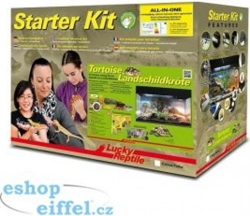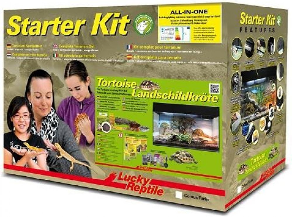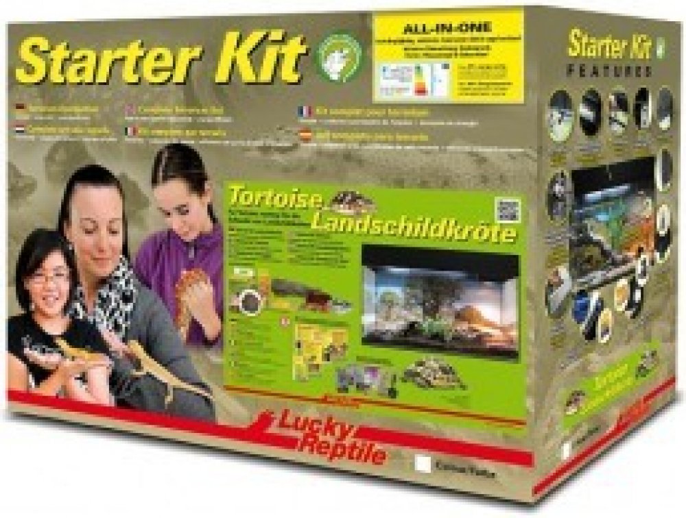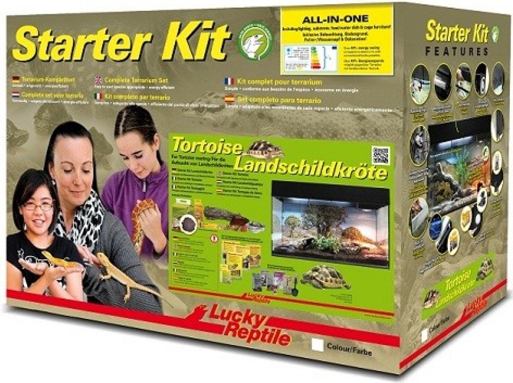 Starter Kit Tortoise je skleněné terárium ve dvou barevných provedeních, černé a bílé. Obsahuje vše, co je třeba pro začátek chovu mláďat suchozemských želv, včetně osvětlení, dekorací, plakátu na pozadí, substrátu a misky na krmení. Součástí balení je brožurka a/nebo DVD v cizím jazyce o chovu želv.