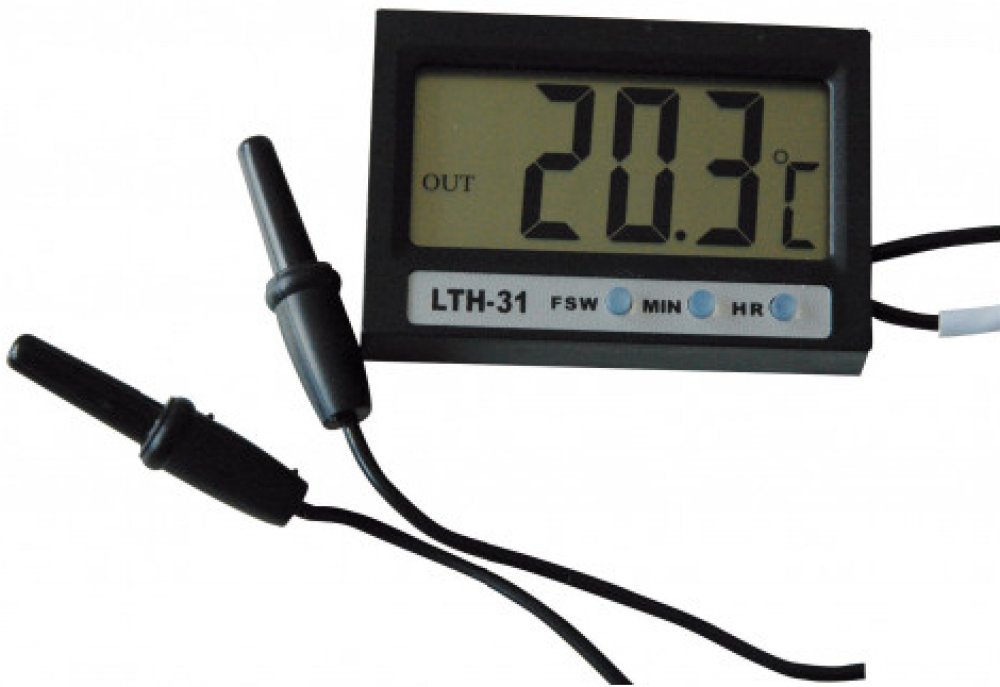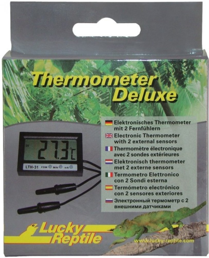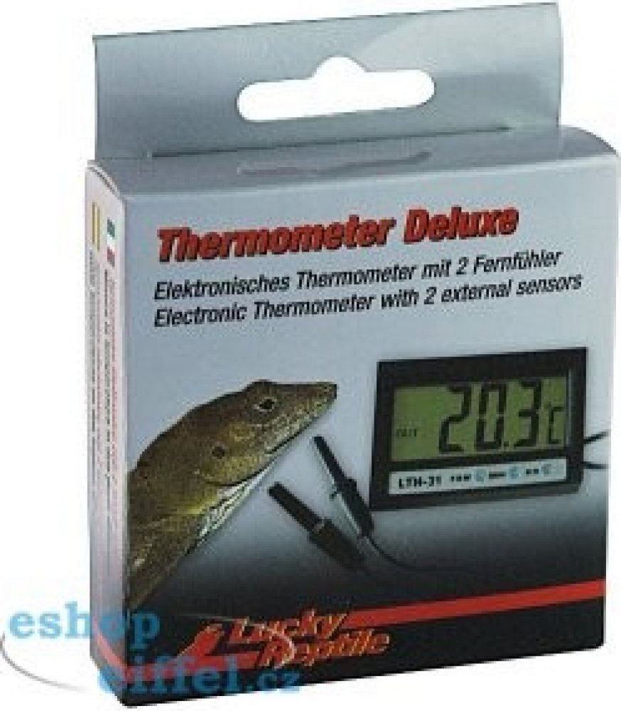 Lucky Reptile Thermometer Deluxe - Základní typ elektronického teploměru s digitálním displejem. - Teploměr je vybaven externím senzorem, měří tedy teplotu na dvou místech současně. Tento senzor je vhodný také k měření teploty vody. Snadné odečtení naměřených hodnot umožňuje velké provedení displeje.