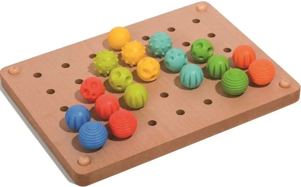 Balení obsahuje 35 velkých silikonových kolíčků s odlišně strukturovaným povrchem v 7 barvách. Dále obsahuje 12 barevných obrázků se zvířátky a 6 oboustranných předloh, dřevěný podstavec s otvory na kolíčky a 4 barevné tkaničky k vyšívání.