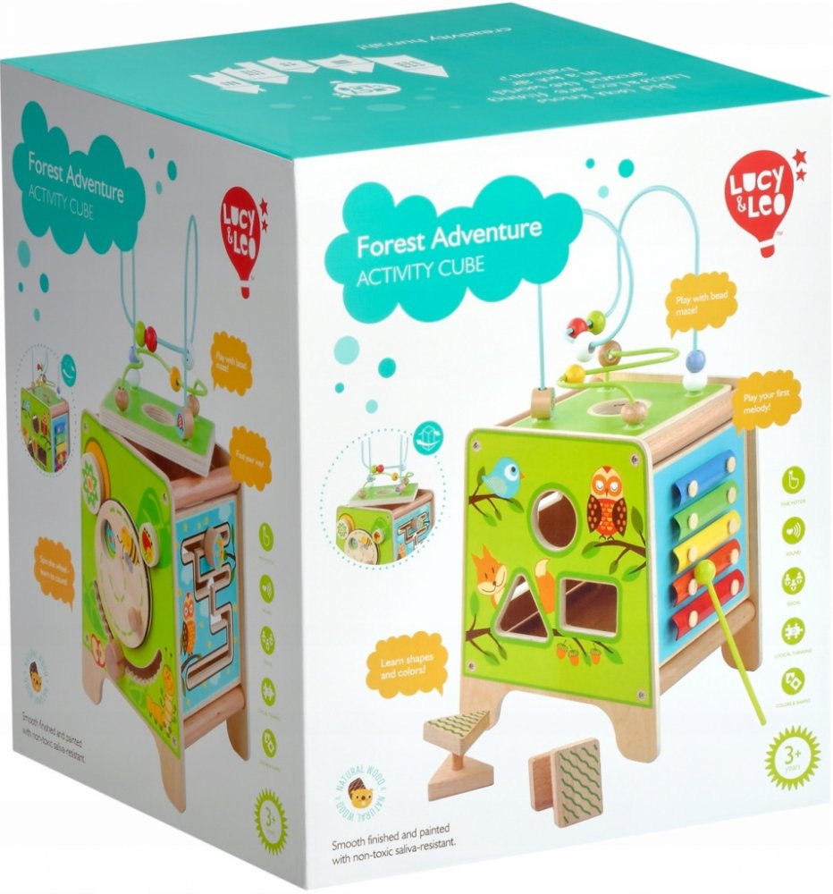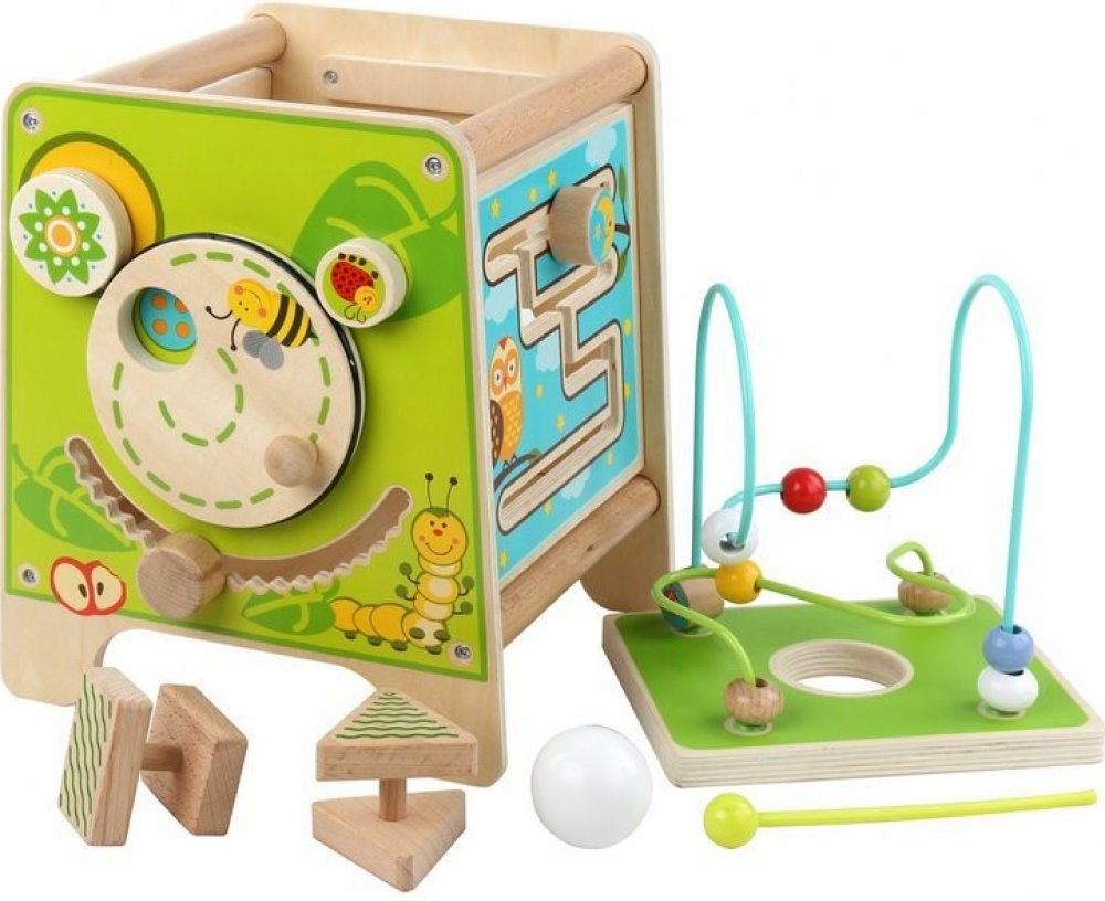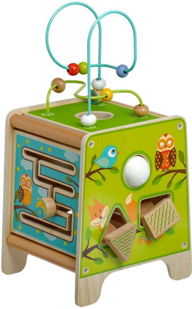 Dřevěná motorická kostka 5v1 s xylofonem kombinuje několik vzdělávacích a zábavných prvků najednou. Nahoře najdete korálkový labyrint se dvěmi zakřivenými kolejnicemi, který se dá vyjmout a otočit směrem do kostky tak, aby byl zcela uschován. Na ostatních stranách je xylofon s paličkami, vkládačka dvoudílných rotačních geometrických tvarů, dřevěný motorický labyrint, rotující kolečko, otočné prvky...