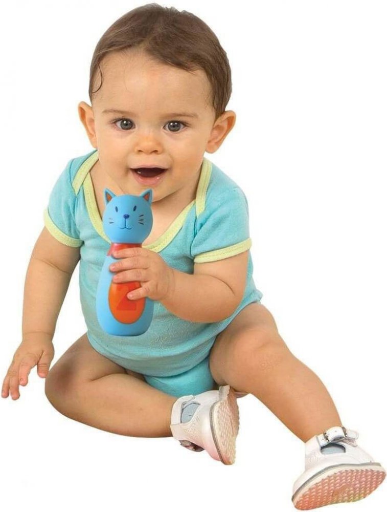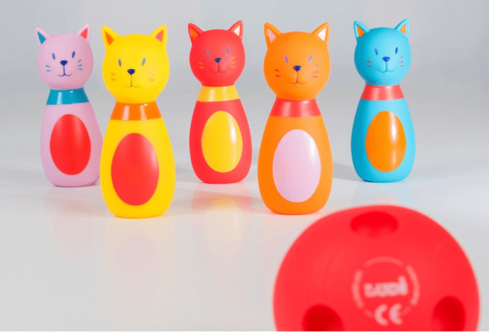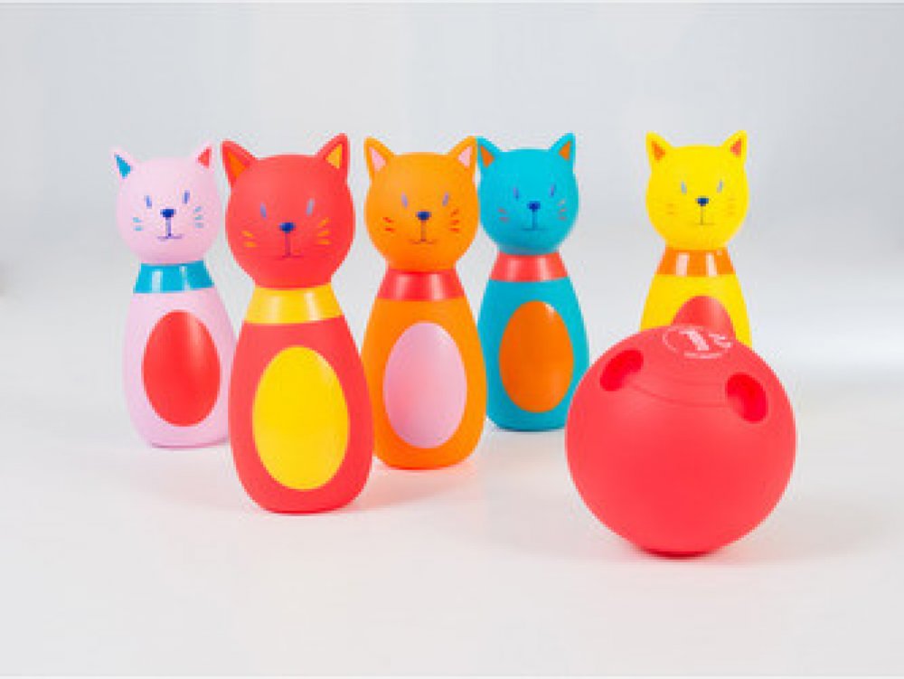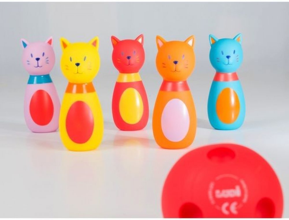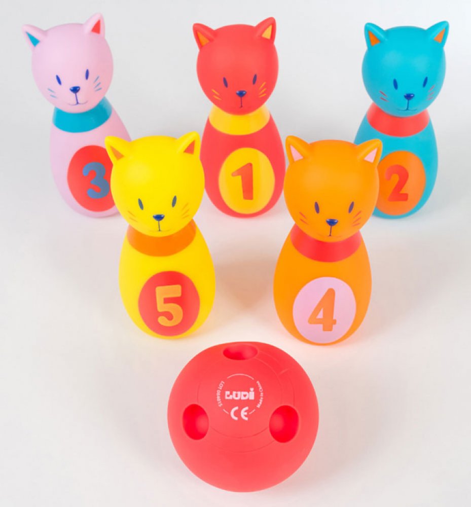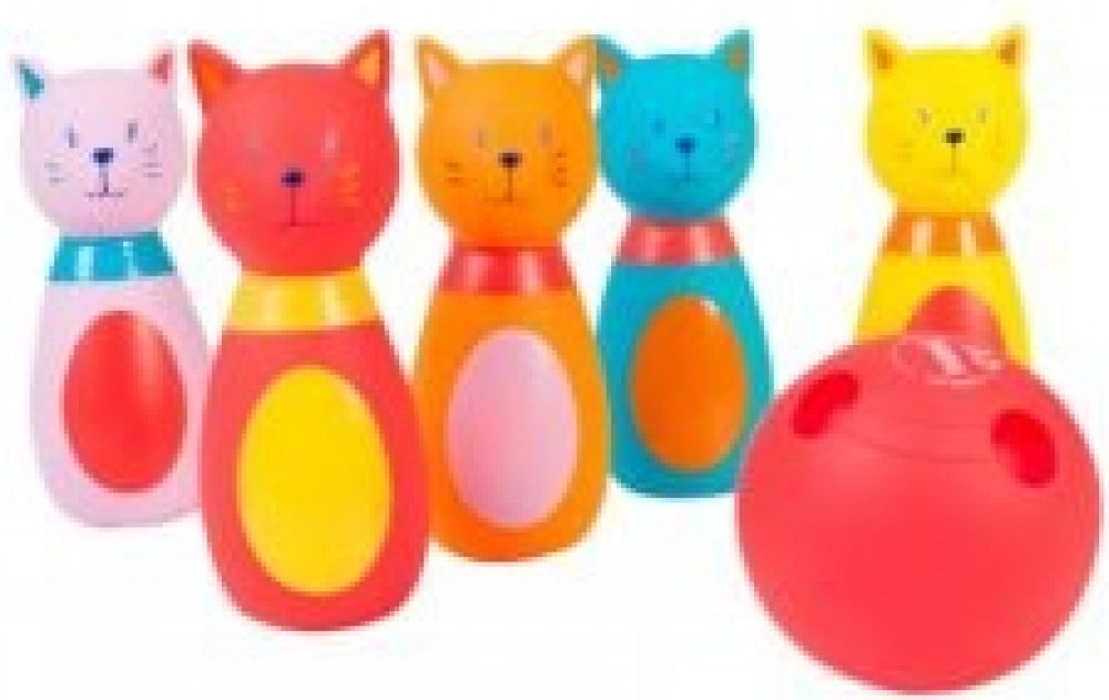 Roztomilá sada pěti kuželek ve tvaru kočiček a koule s otvory jako pro opravdové hráče bowlingu. Vyrobeno z měkkého materiálu pro bezpečnou a příjemnou hru. Kočičky po zmáčknutí pískají.