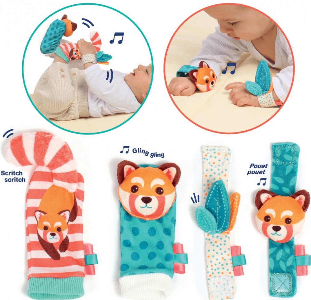 Chrastítka se snadno připevní s pomocí suchého zipu dítěti na zápěstí a navléknou na nožičky.