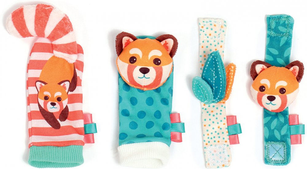 Chrastítka s veselými obličeji pandy podněcují rozvoj sluchu, zraku a hmatu dítěte.