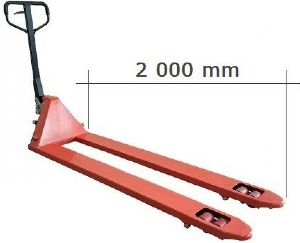 Dlouhý paletový vozík BF2000v je svými rozměry vhodný zejména pro převoz delších atypických palet nebo dvou EUROpalet. Vidlice mají délku 2 000 mm.I přesto je však vozík velmi dobře ovladatelný a to nejen díky své konstrukci a silné hydraulické jednotce, ale také ergonomické ovládací oji s pogumovaným madlem a velkému otočnému úhlu řízení (až 210°). V přední části vidlic jsou malá spodní nájezdová kolečka, která se starají o snadné příčné zajetí do palety. Nosnost paletového vozíku BF2000v je 2 000 kg. Vozík má kvalitní galvanicky pokovené hydraulické čerpadlo, celkově pevnou a zesílenou konstrukci s dostatkem mazacích bodů a silné práškové lakování - to vše prodlužuje životnost stroje. Osazen je koly střední tvrdosti, kdy na litinovém středu je silná vrstva kvalitního polyuretanu. Taková kola jsou vhodná pro téměř každý povrch, jsou směrově stabilní a mají dlouhou životnost; na přání lze zaměnit za gumová nebo nylonová.