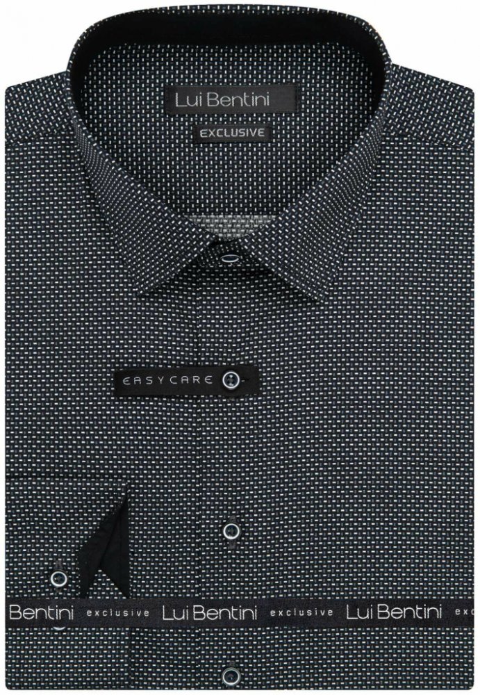 Luxusní pánská košile značky Lui Bentini s dlouhým rukávem. Pánská košile Lui Bentini v černé barvě se vzorem bílých obdélníčků. Košile se hodí jak do zaměstnání, tak na běžné nošení i do společnosti. V této košili Vám bude velmi příjemně díky použití kvalitního materiálu (100% bavlny).