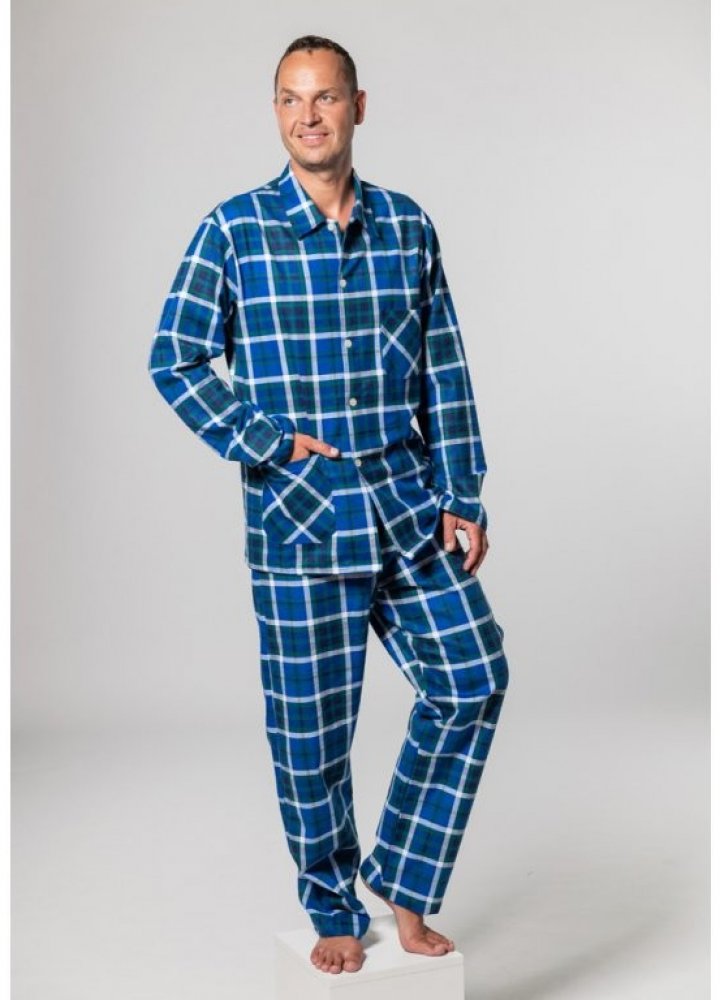 Pánské dlouhé pyžamo z vysoce kvalitního tištěného a oboustranně počesaného flanelu. Kábátek je celopropínací s možností rozhalenky nebo zapínání až ke krku. Na přední straně kabátku jsou dvě praktické kapsičky. Kalhoty mají v pase vyměnitelnou pohodlnou širokou gumu.