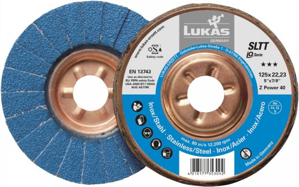Turbotalíř Lukas. Rovné provedení. Výjimečný řezný výkon díky novému patentovanému tvaru lamel a jejich uspořádání. Inovativní design se 70% pokrytím kotouče brusným materiálem. Až 6 brusných vrstev uspořádaných na sobě. Výhody běžných vejířových kotoučů. LUKAS brusný lamelový talíř SLTT Z Power ø 125 mm zrnitost 60.