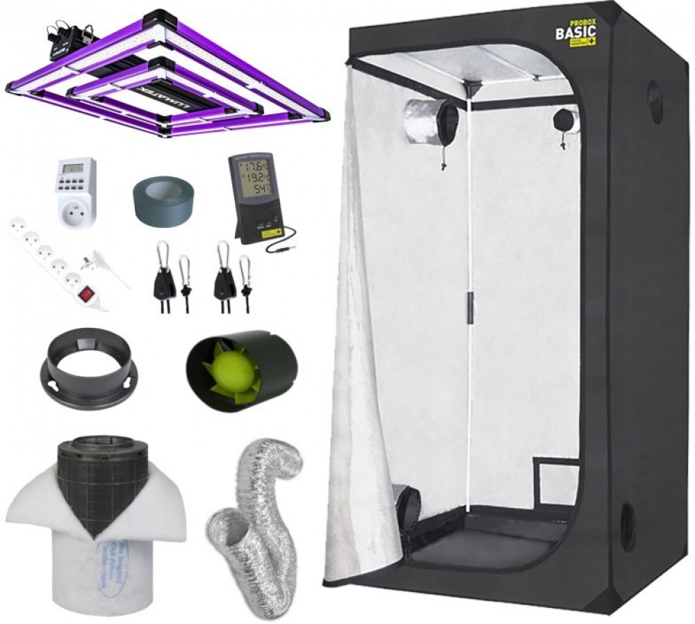 Kit obsahuje: PROBOX BASIC 80, 80x80x160cm Lumatek ATS 200W PRO 2,5 PROFAN Axial Inline Fan 100mm, 107m3/h Kabel 2m včetně zástrčky Filtr CAN-Lite 150m3/h 100mm Can příruba Combiflex 102mm SunPro Rope Ratche 48Kg Digitální spínací hodiny pro zvýšenou indukční zátěž Digitální Thermo-Hygro metr MEDIUM se sondou Prodlužovací kabel s 5 zásuvkami, 5m Ducttape 10m