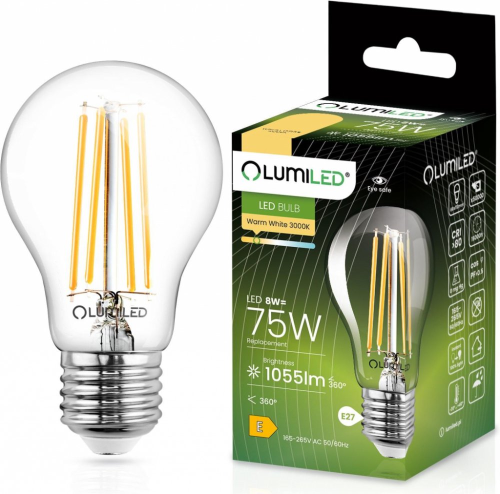 LED žárovka E27 A60 8W = 75W 1055lm 3000K Teplá 360° Filament LUMILED