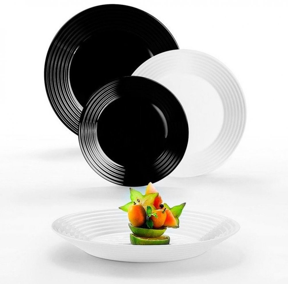 Jídelní sada Harena od Luminarc je vyrobena z bílého a černého tvrzeného skla. Tvrzené sklo bylo podrobeno tepelnému zpracování, aby se zvýšila jeho kvalita a odolnost vůči otřesům a nárazům. Sklo je z neporezního materiálu a proto nezadržuje mikroorganismy, je 100% hygienické. Jednoduchost, čistá bílá a černá barva, kvalita a přijatelná cena, série vhodná jak pro domácnost tak i pro profesionální gastronomii. Jídelní sada obsahuje: 6 x mělký talíř 25 cm 6 x hluboký talíř 23,5 cm 6 x dezertní talíř 19 cm Vhodné do mikrovlnné trouby a myčky.