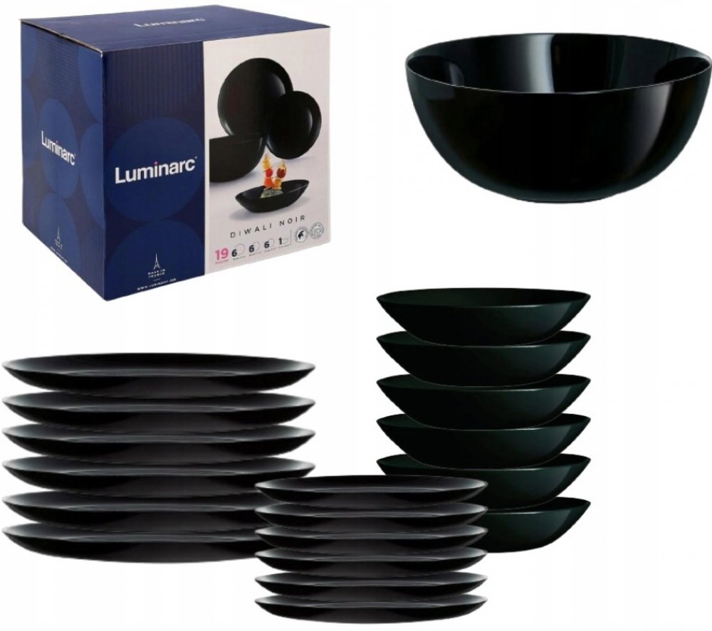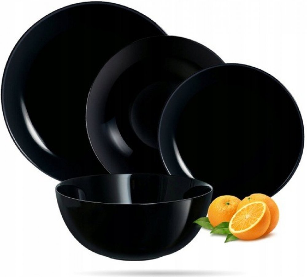 Elegantní 19dílná černá souprava jídelních talířů francouzské výroby z tvrzeného opálového skla. Sklo vykazuje vysokou odolnost vůči nárazům a můžete jej bez obav použít v mikrovlnné troubě i myčce na nádobí. Jednoduchost a elegance soupravy oživí vaše stolování. Černá bude ve vašem interiéru působit univerzálně a při tom neotřele. Souprava obsahuje: 6x talíř plochý 25 cm, 6x talíř hluboký 23,5 c...
