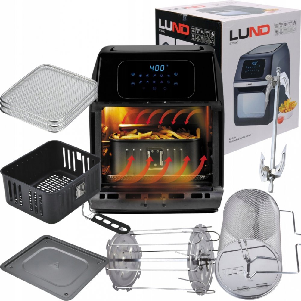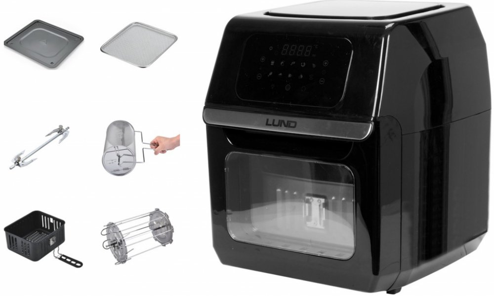 Multifunkční trouba (fritéza) s objemem 12 litrů a vysokým výkonem 1800 W. Rozmanité příslušenství umožní m.in. smažení hranolků, příprava kuřete, špízů, koláčů, ryb a také sušení hub a ovoce. Zařízení umožňuje zvolit jeden z 10 automatických programů nebo zvolit manuální teplotu a dobu ohřevu.