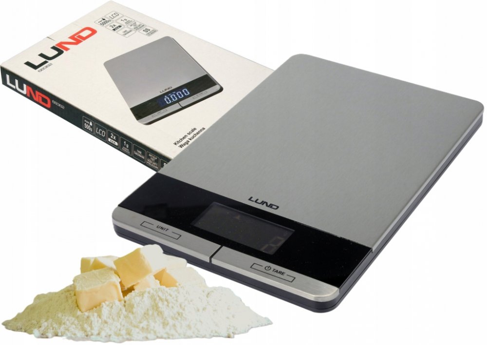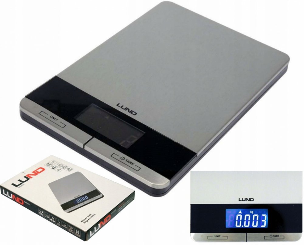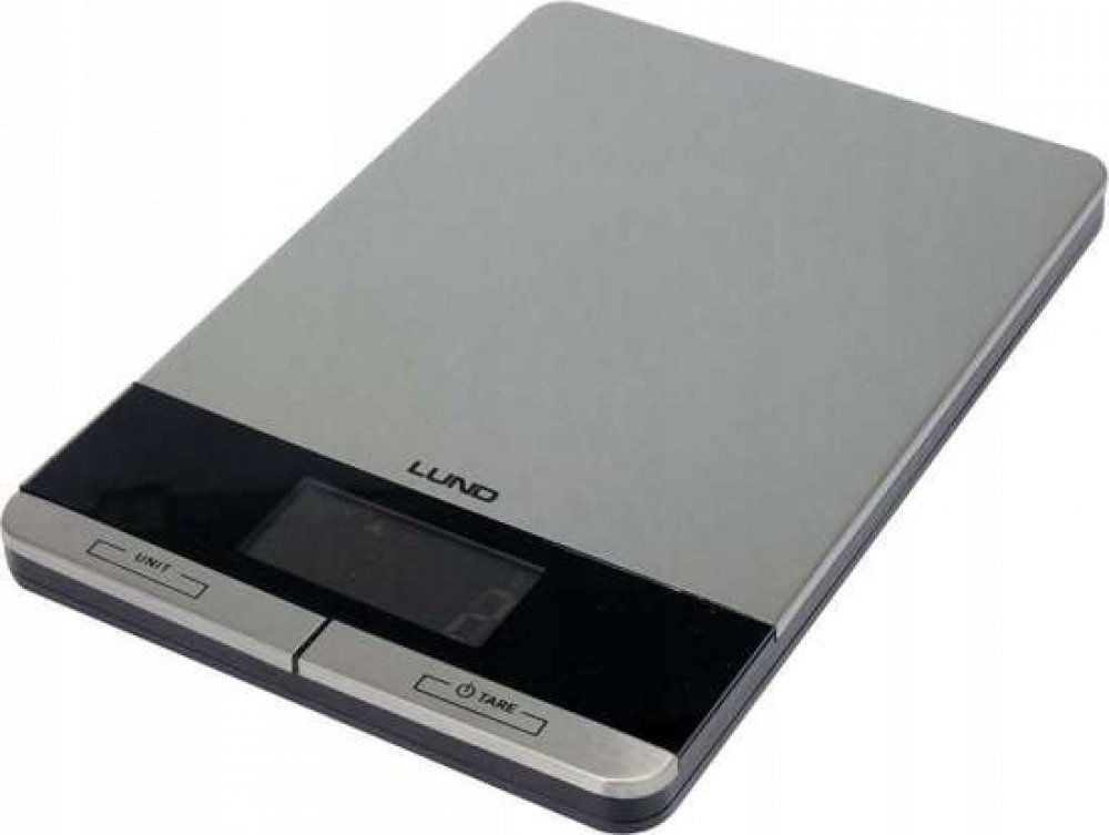 Kuchyňská váha LUND s deskou vyrobenou z z nerezové oceli. Maximální zatížení je až 5 kg.