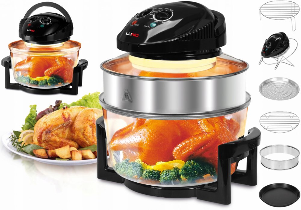 Příkon zařízení 1400W zajistí, 3x až 5x rychlejší pečení v porovnání s tradiční troubou. Výkon je plynule regulovatelný ( 65-250°C ) navíc lze nastavit i časovač až do 60 minut.