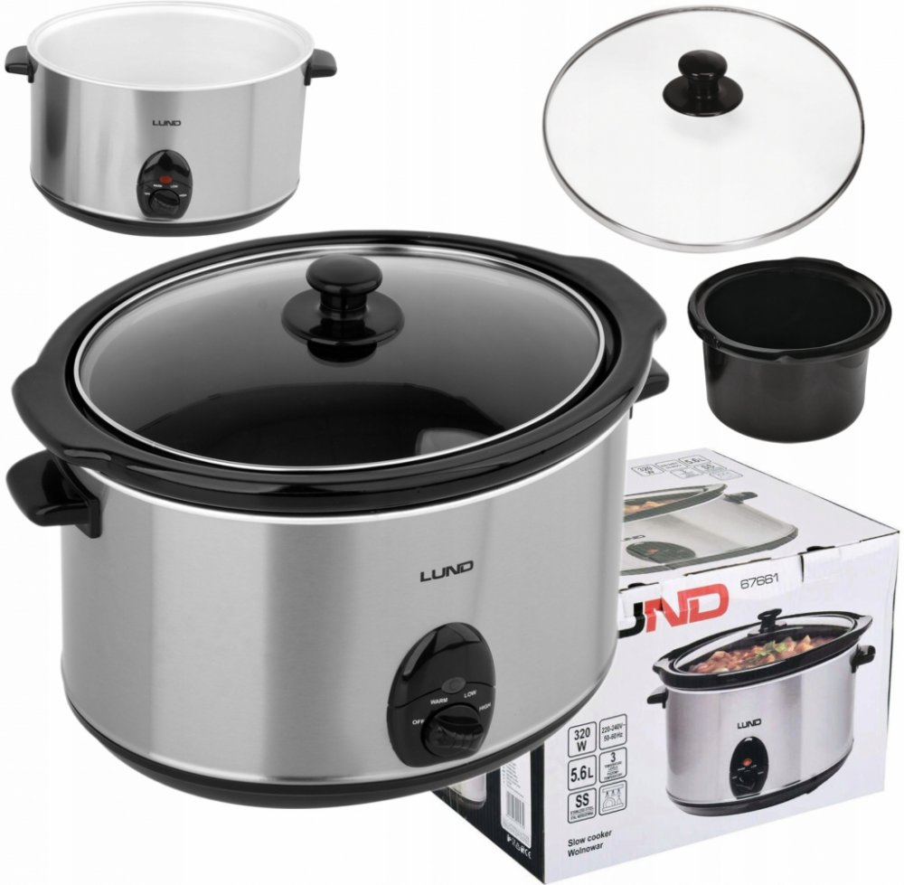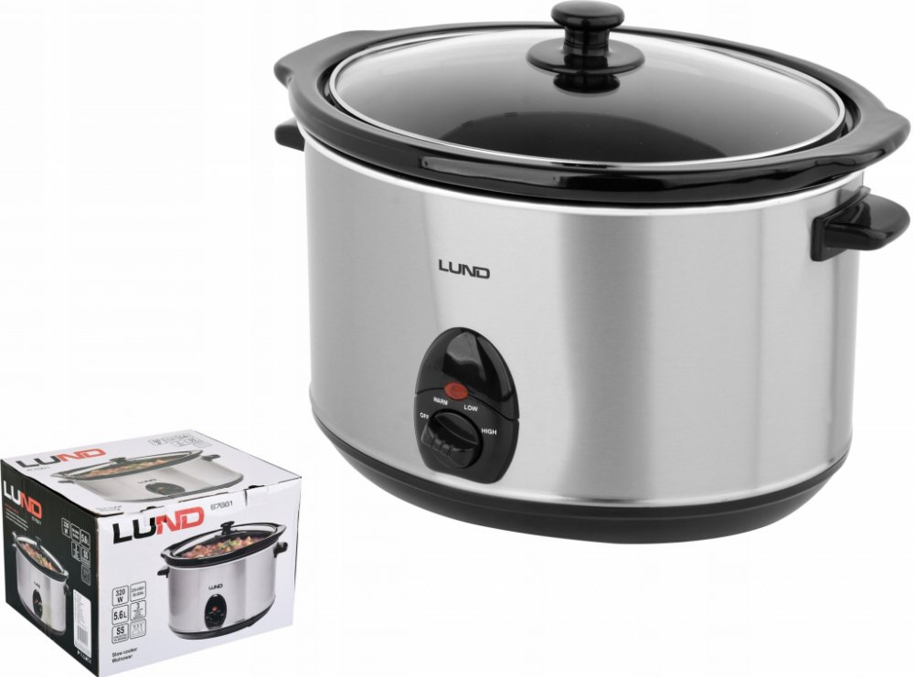 Pomalý vařič určený pro pokrmy, které vyžadují dlouhé vaření, nebo dušení na nízkém plameni. Při pomalém vaření je zachováno více nutričních hodnot a vitamínů. Zařízení je napájeno 1,1 m dlouhým 230V kabelem. Příkon 320W zajistí dlouhodobé vaření při 80-90°C. Nepřilnavá keramická mísa pro vaření má objem 5,6l a snadno se čiští. Navíc je opatřena skleněným víkem pro optickou kontrolu pokrmů. Tělo je zhotoveno z nerezové oceli oválného tvaru s otočným voličem uprostřed. Pro přenášení je navíc opatřeno madly, která se při vaření neohřívají. Specifikace: • napájení: 230V • délka nap. kabelu: 1,1 m • příkon: 320W • objem mísy: 5,6l • materiál těla: nerez. ocel • rozměry: 38 x 29 x 28 cm • materiál mísy: keramika • ovládací panel: otočný volič