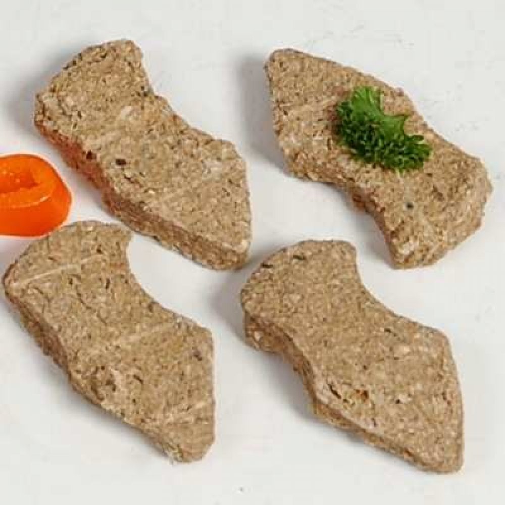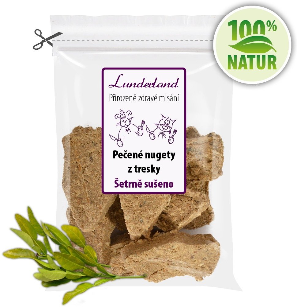 Odřezky tresčího masa z potravinářského zpracování spolu s kousky kůže jsou po namletí zformovány do plochých kousků velikosti 2 x 5 centimetrů a výšky 0,8 centimetru. Následně jsou upečeny. Žádná chemie – Maso pro výrobu pečených nuget není ozařováno, neobsahuje žádné syntetické konzervanty, žádné umělé vitamíny, ani jiné syntetické přidané látky, které organismus zatěžují. Kousky jsou konzervovány pouze vysušením. Složení: 100% treska. Analytické složky: Hrubý protein 51%, hrubý tuk 1%, hrubý popel 16%, vlhkost 14%. Pro zachování čerstvosti a vůně jsou kousky zavařeny v silnostěnném aromatěsném sáčku.