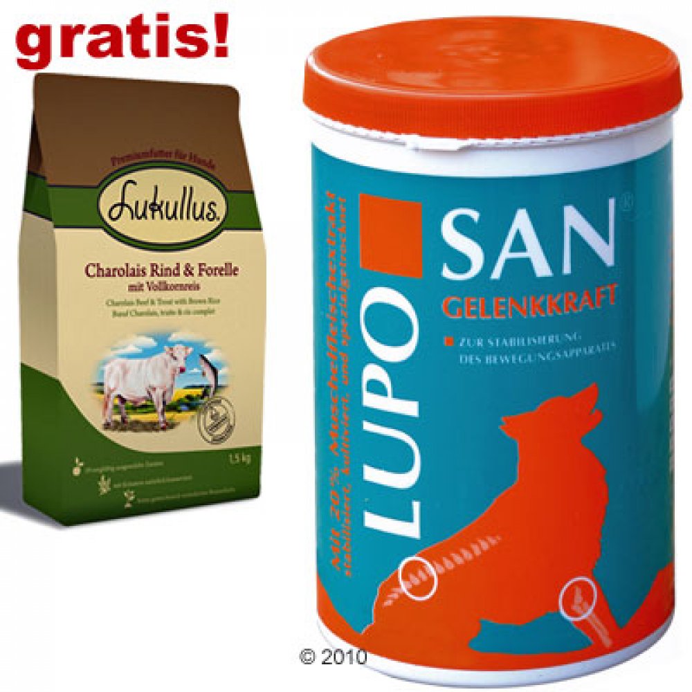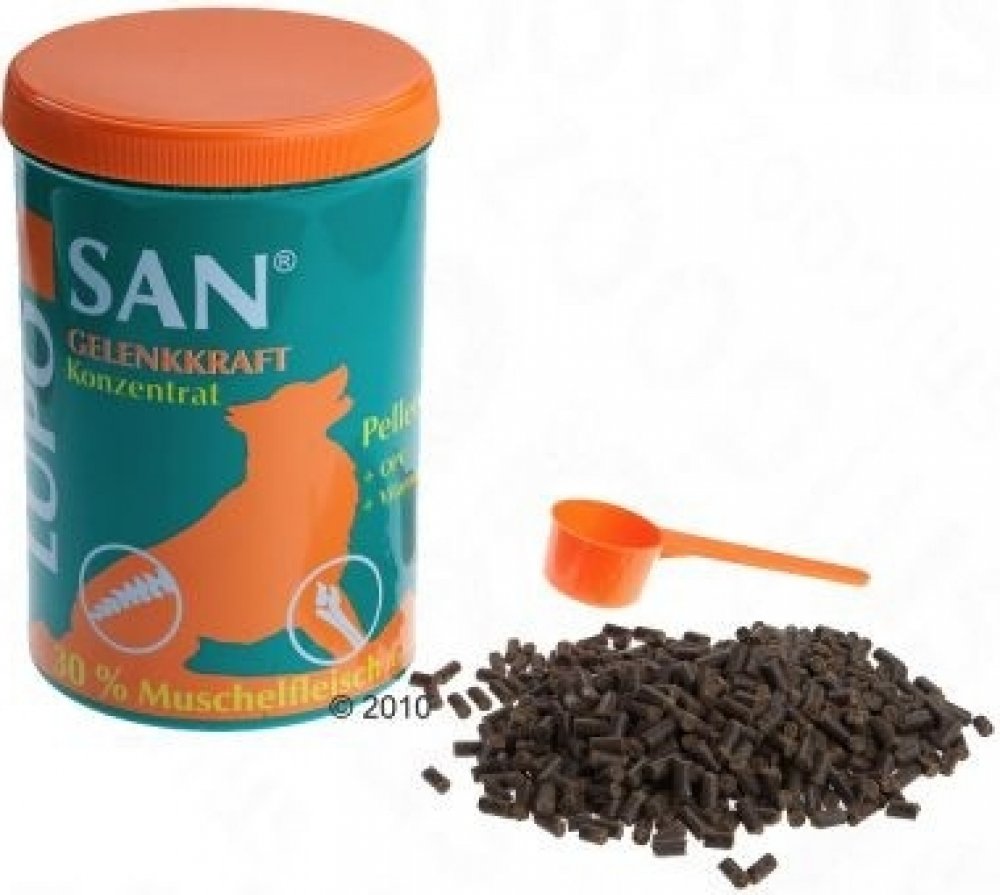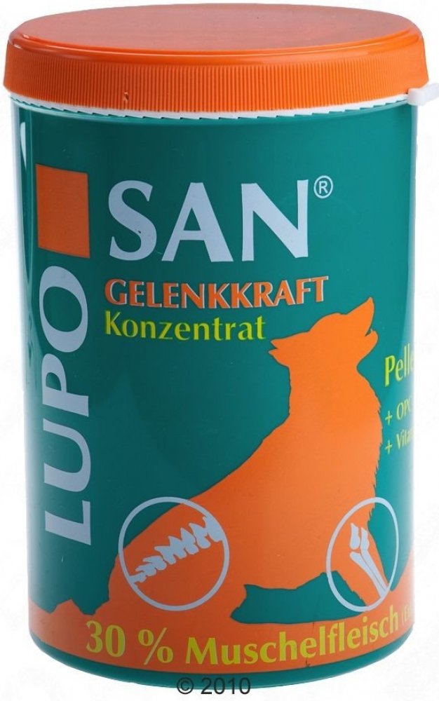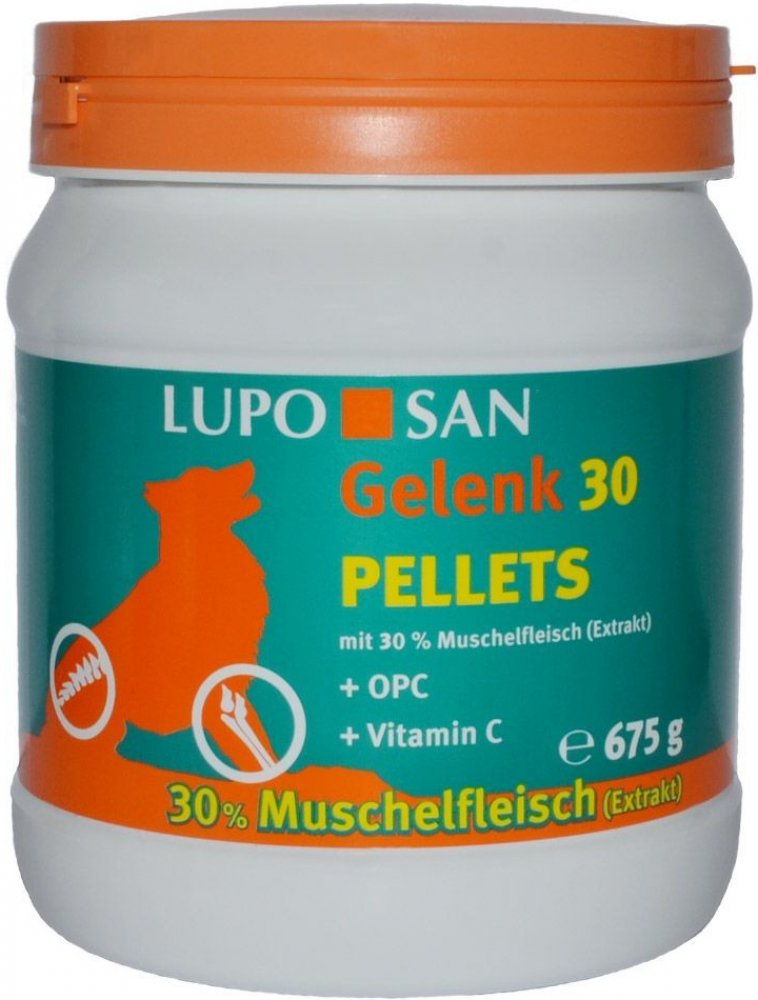 Koncetrát, založený na bázi extraktů, posiluje klouby a dodává do těla jedinečný komplex živin: 30% extraktu z masa mušlí Perna Canaliculus, OPC (vinná jadérka), vitamín C, kyselina gama linolenová a omega-3 mastné kyseliny a další efektivní složky. Výborný doplněk stravy pro starší psy, psy trpící problémy s klouby nebo jako prevence před vznikem problémů s pohybovým aparátem. Luposan Pellets pro zdravé a silné klouby! Luposan Pellets posilující klouby v přehledu: vysoce koncetrovaný doplněk krmiva pro zdravý pohybový aparát pro starší psy, psy s kloubními problémy, jako prevence s důležitým exraktem živin: Nejdůležitejší živiny produktu a jejich přínos pro organismus psa: 30% extraktu z masa mušlí (Perna Canaliculus) vysoký podíl glykosaminoglykanů (GAG) pro ochranu, posílení kloubů, chrupavek, pojivové tkáně, vaziva a šlach podpora výstavby chrupavek a tvorby synovie (kloubního mazu) zvýšení pružnosti pojivové tkáně posílení odolnosti a motivace zejména při tréninku, v období březosti a růstu OPC z vinných jadérek a vitamín C z barbadoské třešně Ideální ochrana kloubů a chrupavek, nejúčinnější kombinace látek působící proti volným radikálům Kyselina gama linolenová a omega-3 mastné kyseliny Z pupalky a divokého lososa - ideální doplněk potravy při zánětlivých problémech s klouby