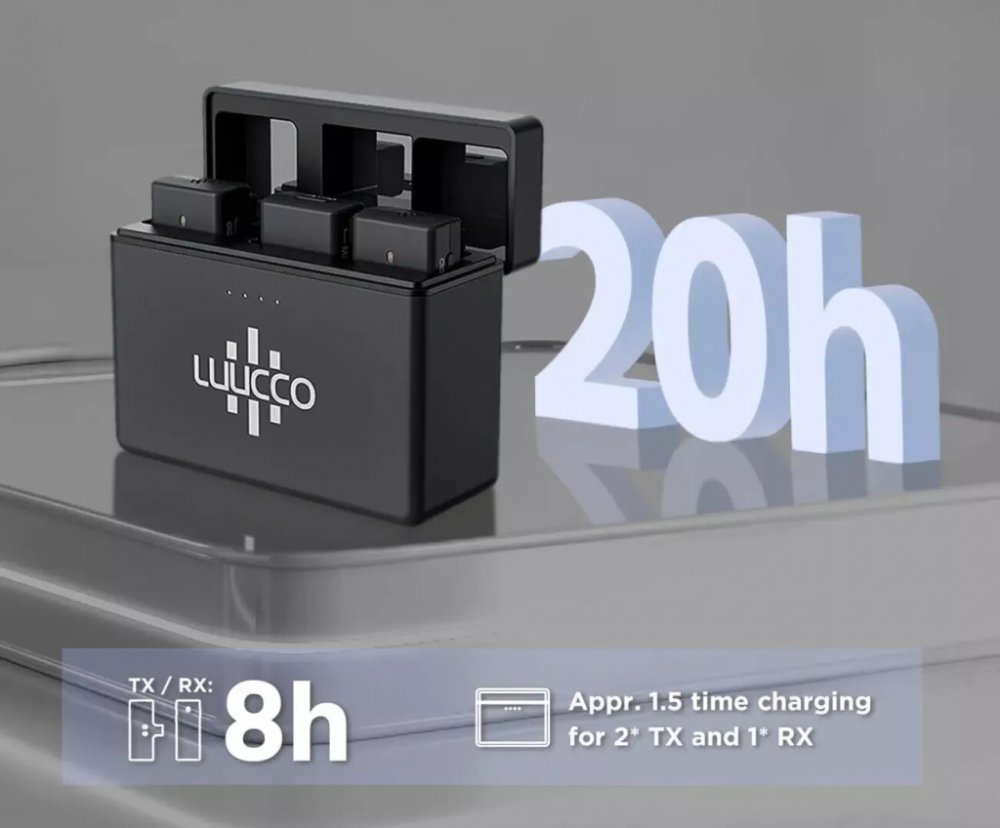 Provozní doba při dobíjení z pouzdra: cca 20 hodin pro 2 vysílače a 1 přijímač