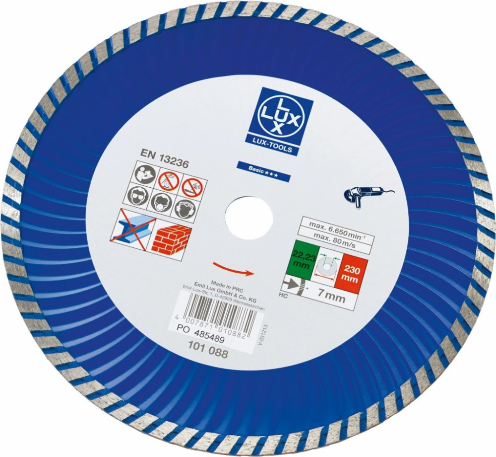 LUX-TOOLS diamantový řezný kotouč Classic o průměru 230 mm spolehlivě řeže tvrdé kameny a stavební materiály. Řezný kotouč má přitom segmentovaný okraj, který zajišťuje rychlý řez. Díky otvoru 22,23 mm se hodí pro použití s běžnými úhlovými bruskami. Řezný kotouč má tloušťku 7 mm.