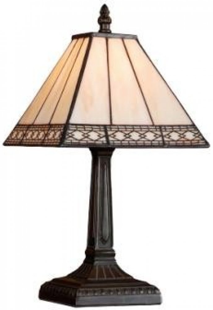 Stolní lampa TIFFANY z kolekce klasického osvětlení slovenského dodavatele LUXERA zaujme svým nápaditým vitrážovým stínidlem ve tvaru pyramidy, který je po okraji zdoben jemným kovovým detailem. Tato lampa se bude vyjímat v každém obývacím pokoji, ložnici či pracovně. Hodí se do interiérů zařízených v klasickém a moderním stylu. Kvůli nižšímu krytí IP20 není vhodná do místností s výskytem vyšší vlhkosti vzduchu. Její hranatá základna a tělo svítidla jsou vyrobeny z odolného kovu s anticky hnědou povrchovou úpravou, která je na povrchu zajímavě tvarovaná. Stínidlo je zhotoveno ze skla a je osazeno paticí E14 o maximálním příkonu 1 x 40 W (zdroj není součástí balení). Svítidlo je třeba umístit minimálně 0,5 m od osvětlovaného objektu. Je napájeno ze sítě na 230 V. Součástí balení je přívodní kabel s vidlicí 2,5A/250V, na kterém je mimojiné umístěn vypínač. Celkové rozměry lampičky činí 34 x 17,5 x 17,5 cm.
