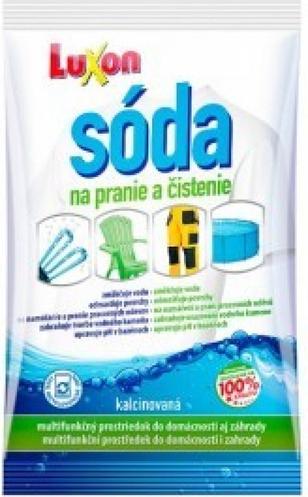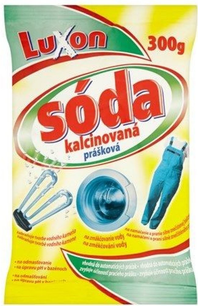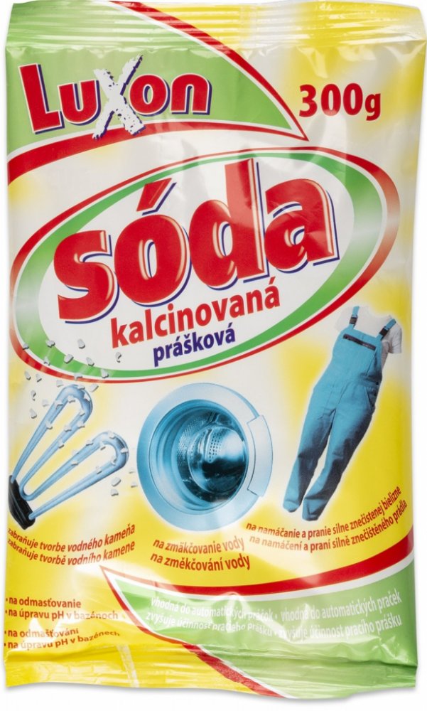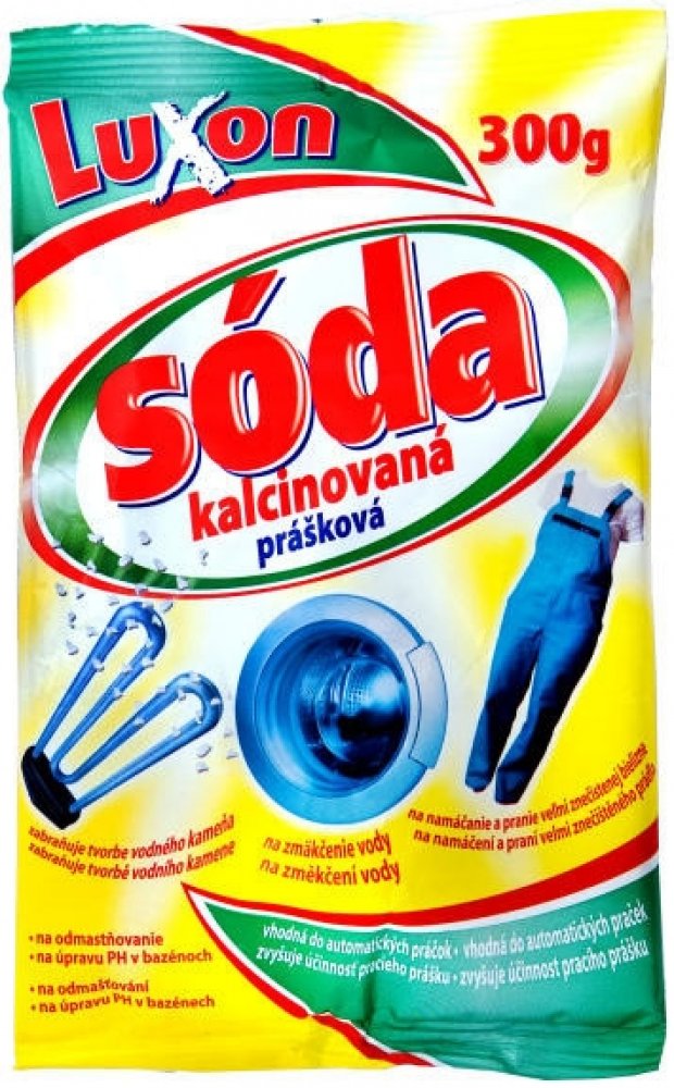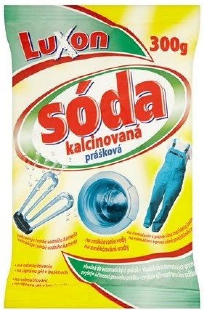 přípravek k změkčení vody k namáčení silně znečištěných oděvů (montérky a jiné) k odmašťování zvyšuje účinnost pracího prášku zabraňuje usazování vodního kamene vhodný k úpravě pH v bazénu LUXON SODA KALCINOVANÁ prášková na změkčování vody na namáčení silně znečištěných oděvů (montérky apod.) na odmašťování zvyšuje účinnost pracího prášku zabraňuje usazování vodního kamene na úpravu pH v bazénech vhodná do automatických praček. Namáčení: 20 - 30 gramů na 10 litrů vody. Praní ve středně tvrdé vodě: 2,5 g na 10 l vody. Praní ve velmi tvrdé vodě: 8 g na 10 l vody. Rovná kávová lžička obsahuje cca 2,5 g sody. Složení: uhličitan sodný (ES 207-838-8). Varování: Způsobuje vážné podráždění očí. Pokyny pro bezpečné zacházení: Uchovávejte mimo dosah dětí. Nevdechujte prach. Po manipulaci důkladně omyjte ruce vodou a mýdlem. Používejte ochranné rukavice a ochranné brýle. První pomoc: PŘI POŽITÍ: Necítíte-li se dobře, volejte TOXIKOLOGICKÉ INFORMAČNÍ STŘEDISKO (tel.: 224 915 402, 224 919 293) nebo lékaře. PŘI VDECHNUTÍ: Přeneste osobu na čerstvý vzduch a ponechte ji v poloze usnadňující dýchání. PŘI ZASAŽENÍ OČÍ: Několik minut opatrně oplachujte vodou. Vyjměte kontaktní čočky, jsou-li nasazeny a pokud je lze vyjmout snadno. Pokračujte ve vyplachování. Přetrvává-li podráždění očí: Vyhledejte lékařskou pomoc. Pokyny k odstranění: Odstraňte obsah a obal ve sběrném místě nebezpečného odpadu.