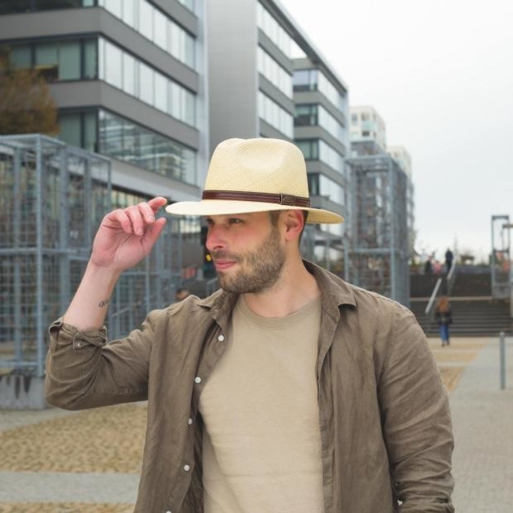 Klobouk z Ekvádorské panamy pro pány i dámy zdobený tmavým koženým páskem a pzdobnou přezkou.