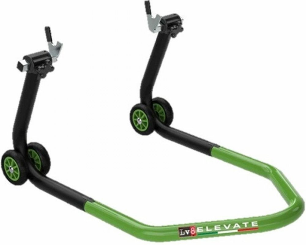 UNIVERSAL REAR STAND WITH V FORK CURSORS - BLACK/GREENPatentovaný zadní stojan na motorku dodávaný ve třech snadno montovatelných dílech - lze ho sestavit bez použití šroubů a šroubováků.Schválený a používaný předními výrobci motocyklů. Součástí je sada vidlicových držáků typu V – kit E620/08C.VLASTNOSTI:3dílná konstrukce, kterou lze sestavit bez použití šroubů nebo šroubovákůSchváleno předními výrobci motocyklůPatentovaný systém spojení pro snadnou a rychlou montážOchrana proti poškrábání při kontaktu se zemíBezespará konstrukce pro maximální pevnost a stabilituDržáky s posuvníky z polyamidu s úchopovým kolečkem a závitovým čepem4 barevná kolečka z termoplastické pryžeK dispozici v 7 různých barvách