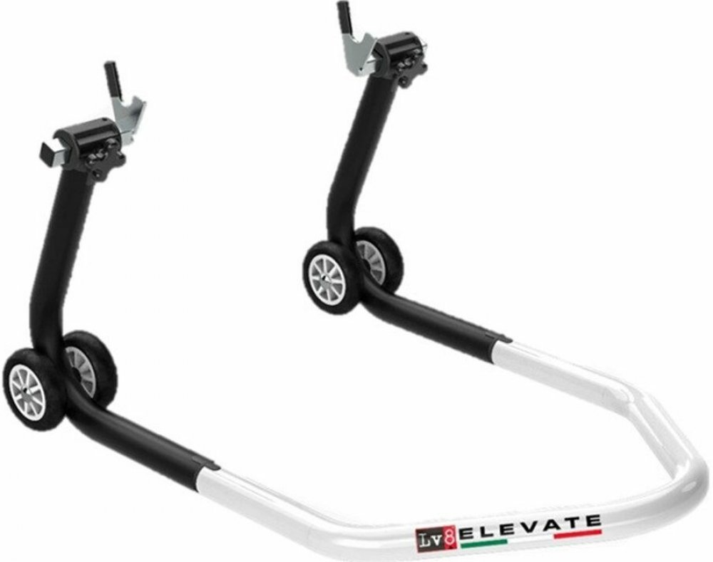 UNIVERSAL REAR STAND WITH V FORK CURSORS - BLACK/WHITEPatentovaný zadní stojan na motorku dodávaný ve třech snadno montovatelných dílech - lze ho sestavit bez použití šroubů a šroubováků.Schválený a používaný předními výrobci motocyklů. Součástí je sada vidlicových držáků typu V – kit E620/08C.VLASTNOSTI:3dílná konstrukce, kterou lze sestavit bez použití šroubů nebo šroubovákůSchváleno předními výrobci motocyklůPatentovaný systém spojení pro snadnou a rychlou montážOchrana proti poškrábání při kontaktu se zemíBezespará konstrukce pro maximální pevnost a stabilituDržáky s posuvníky z polyamidu s úchopovým kolečkem a závitovým čepem4 barevná kolečka z termoplastické pryžeK dispozici v 7 různých barvách