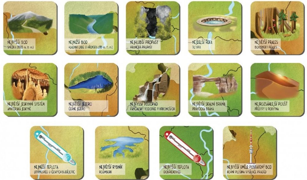 - Nejvyšší bod, Nejnižší bod, Nejhlubší propast, Nejdelší řeka, Největší propast, Největší jeskynní systém, Největší jezero, Nejvyšší vodopád, Největší skalní brána, Nejrozsáhlejší poušť, Nejnižší teplota, Nejvyšší teplota, Největší rybník, Nejvyšší uměle postavený bod.