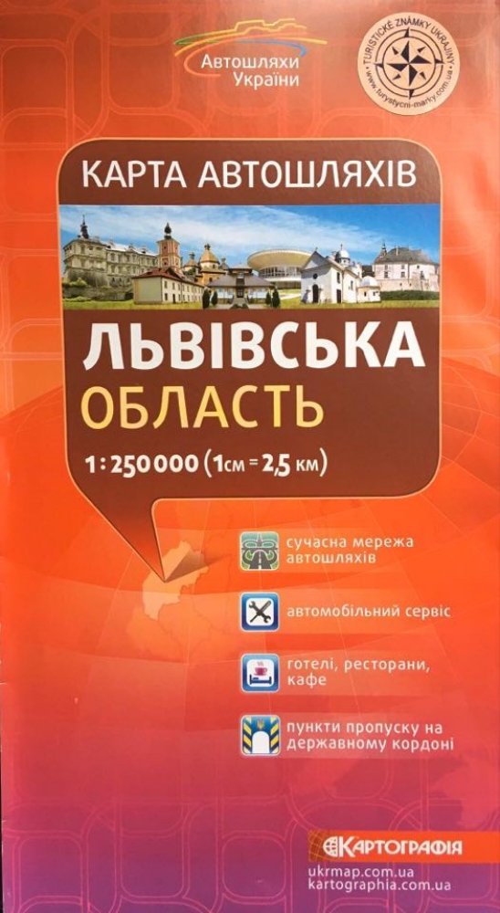 rozměr: 12,5 x 24 cmjazyk: ukrajinštinalegenda: ukrajinsky, anglickyzadní strana:mapa Ukrajiny, plánky větších měst, vzdálenosti mezi městy atd.