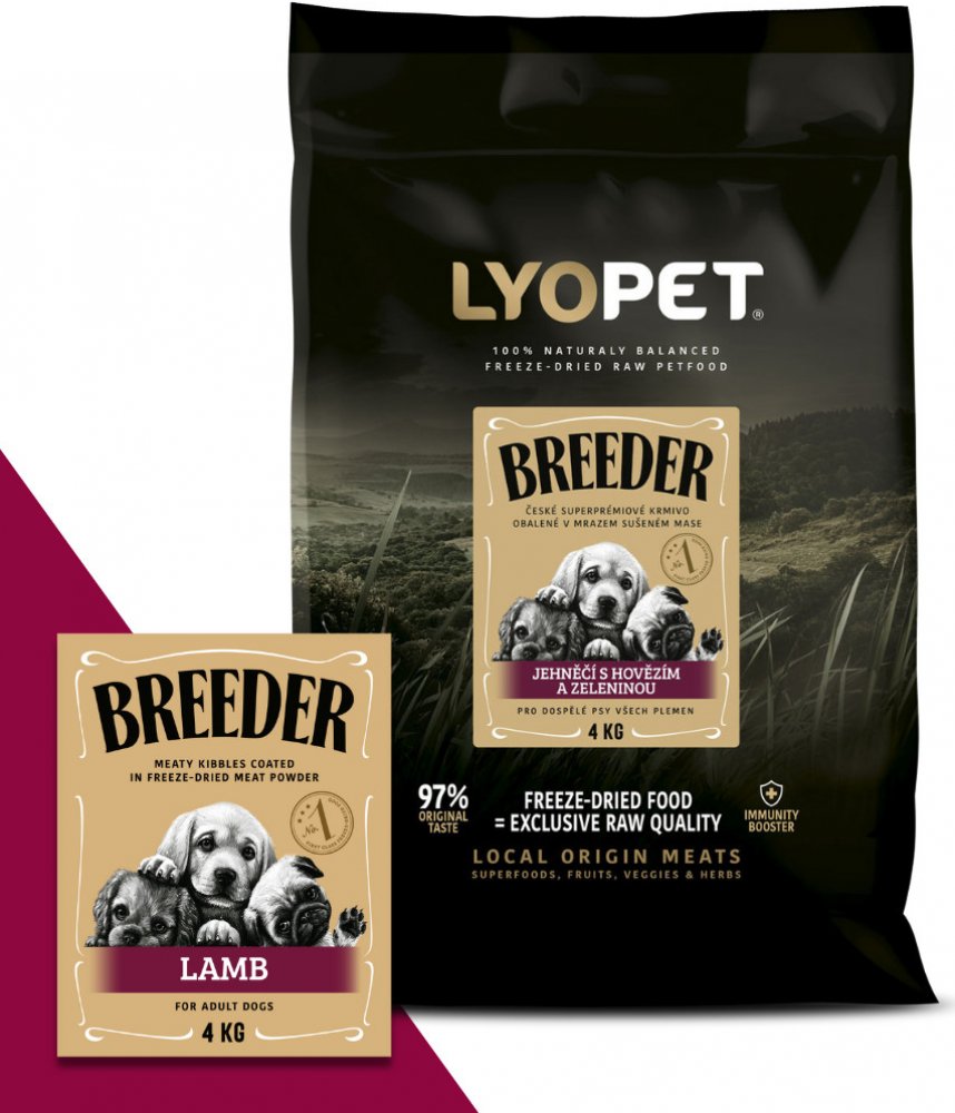 Breeder, to jsou české hypoalergenní granule pro psy, které si díky inovativnímu a šetrnému zpracování pomocí lyofilizace neboli sušení mrazem plně zachovávají přirozený obsah výživových hodnot všech použitých surovin.