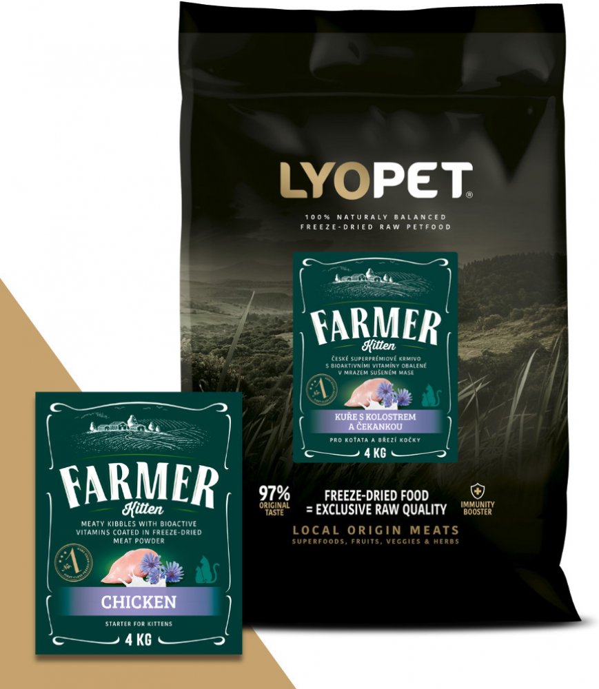 Farmer je české krmivo nové generace, které obsahuje kuřecí granule obalené v mase sušeném mrazem a BIO kolostru. Díky unikátní technologii jsou zachovány přirozené nutriční hodnoty všech použitých surovin.