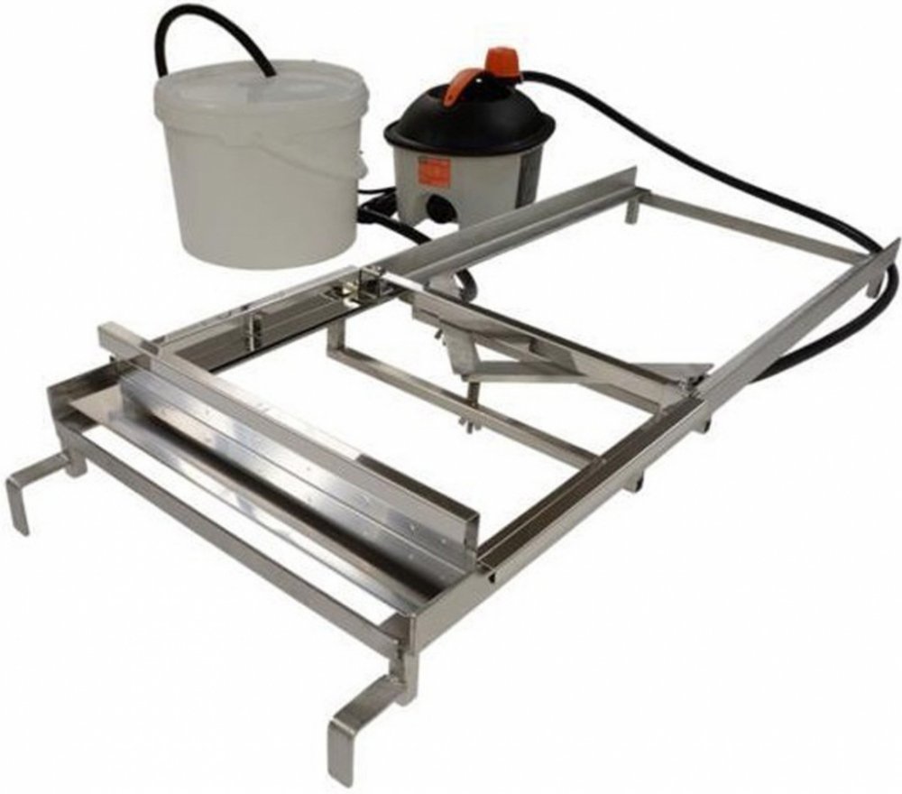 Zařízení je navrženo tak, aby se pohodlně umístilo na standardní nebo zesílený odvíčkovací stůl Lysoň. Můžete jej samozřejmě použít i s jinou vhodnou odvíčkovací nádobou. Celá konstrukce je robustní a zároveň přehledná, takže obsluha zvládne práci i při větším objemu rámků.