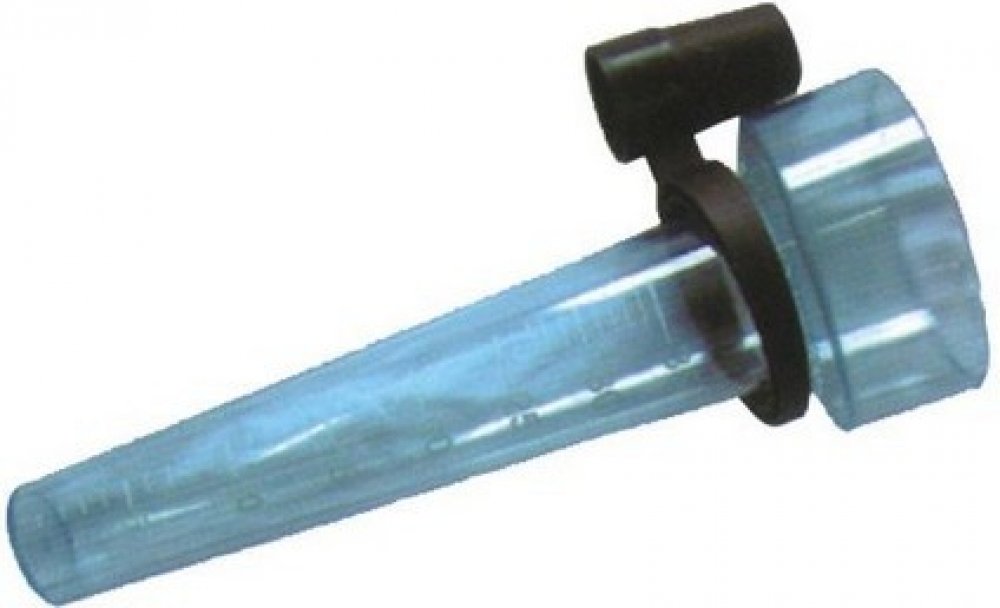Srážkoměr s držákem, který umožňuje přímý odečet úhrnu srážek ze stupnice vylisované na samotném srážkoměru.