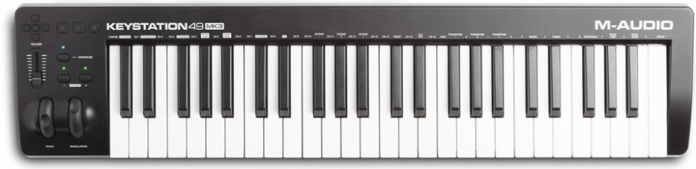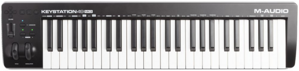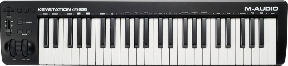 USB/MIDI keyboard M-Audio Keystation 49 MK3 je praktický MIDI kontrolér, pomocí nějž naplno využijete potenciál svých softwarových nástrojů. K dispozici je polovyvážená klaviatura s dynamickou citlivostí, výšku tónu a modulace zvuku můžete regulovat pomocí koleček na levé straně klaviatury. Pro další ovládání jsou k dispozici transpoziční tlačítka, volume fader a transportní funkce pro ovládání vašeho hudebního softwaru, abyste nemuseli sahat po myši. Napájení probíhá pomocí USB a kontrolér podporuje iOS konektivitu, takže ho s příslušným adaptérem (není součástí balení) můžete připojit například k iPadu. Ke kontroléru dostanete také nabitý balík software, abyste mohli naplno rozvinout svůj kreativní potenciál. Balení obsahuje Ableton Live Lite, MPC Beats, virtuální piano Air Music Mini Grand, virtuální elektrické piano Air Music Velvet, viruální syntezátor Xpand!2 a další.