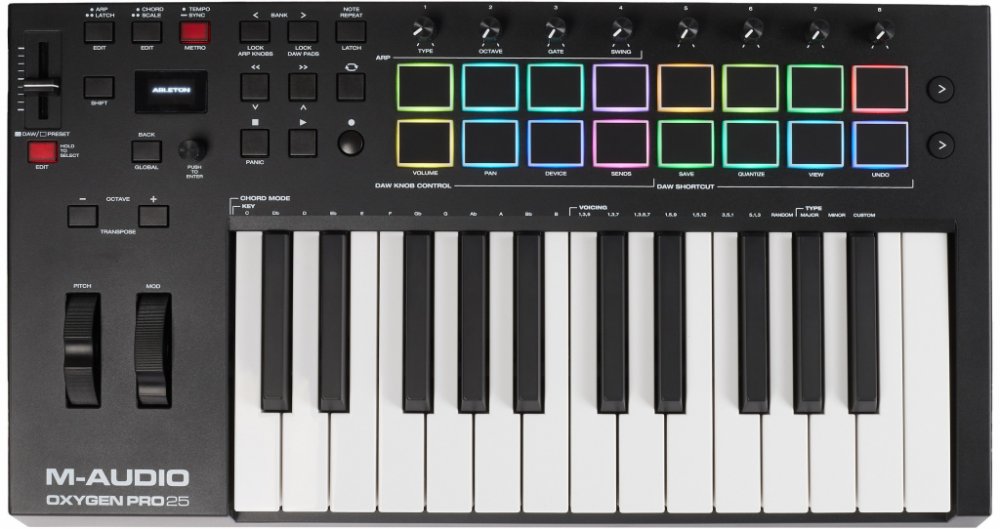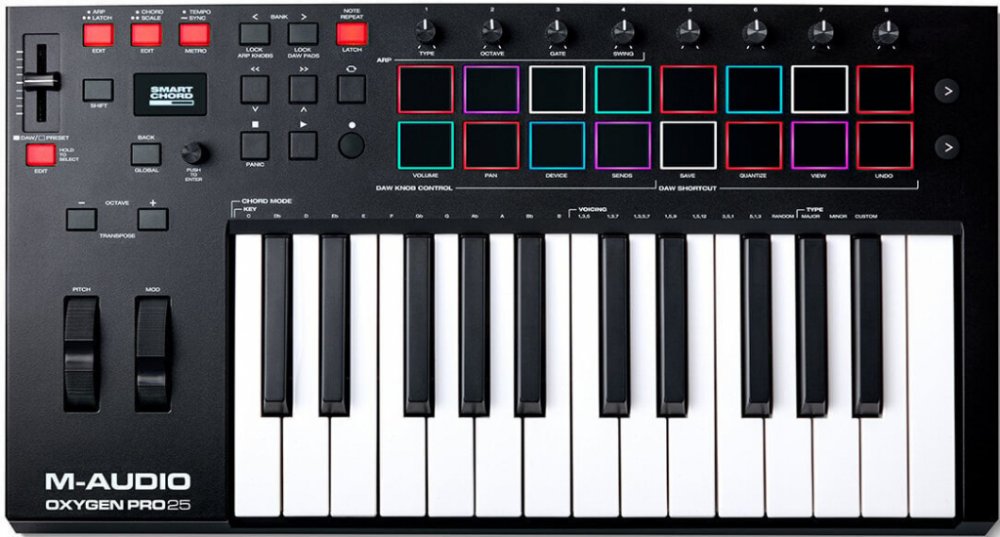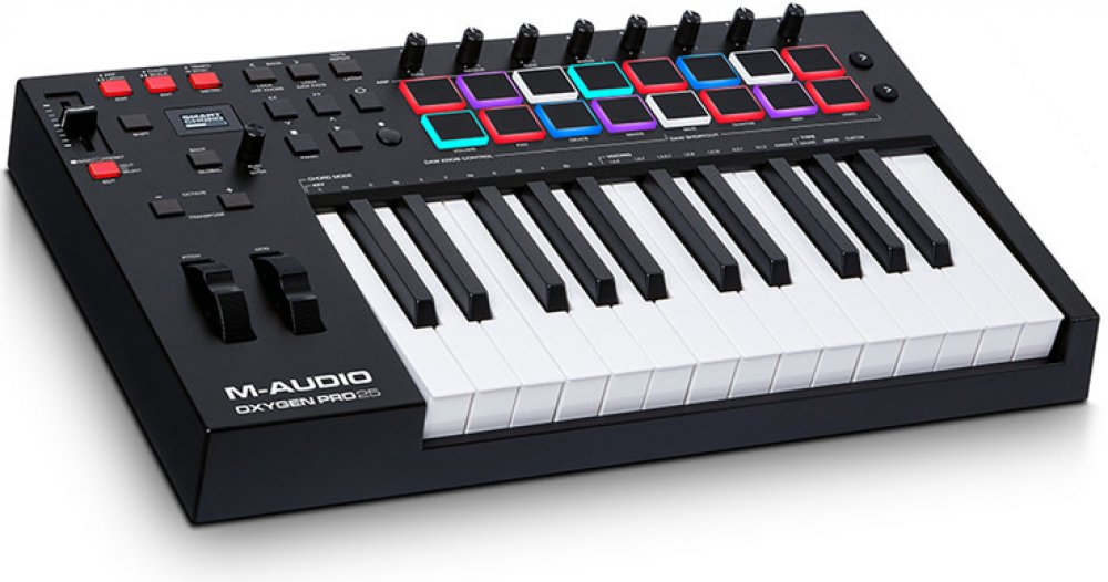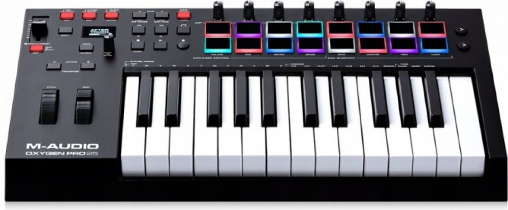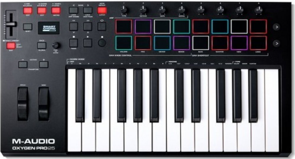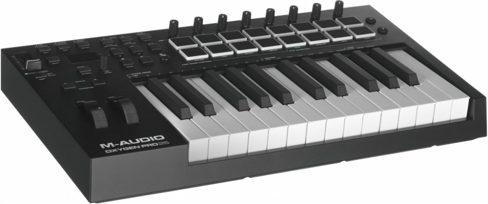 USB/MIDI keyboard M Audio zařadili do svého arzenálu další řadu MIDI klávesových kontrolérů. Klávesy Oxygen Pro ve čtyřech velikostech disponují novým inteligentním ovládáním, funkcí automatického mapování a integrovaným arpeggiatorem. Součástí balení je navíc velký SW bundle v podobě MPC Beats, Ableton Lite Lite, Pro Tools first a další. Značka M-Audio, synonymum pro inovativní technologie hudební produkce, představila zbrusu novou řadu klávesových kontrolérů, Oxygen Pro. Tyto nové klávesové kontroléry jsou určeny hudebním producentům po celém světě, kteří chtějí profesionální funkce, maximální kontrolu nad svými virtuálními nástroji a možnost dokonale přesného hraní na zábavném a snadno ovladatelném kontroléru. Kontroléry M-Audio Oxygen Pro jsou špičkové nástroje pro živé hraní i pro potřeby studia, díky kterým se budete moci soustředit výhradně na svou hudební tvorbu – ne na složité programování. Oxygen Pro 25 je napájená prostřednictvím USB a disponuje OLED displejem, technologiemi Smart Chord a Smart Scale, funkcí automatického mapování, integrovaným arpeggiatorem a funkcí opakování tónu, což jsou v dnešní produkci moderní hudby zásadní prvky a funkce. Oxygen Pro 25 obsahuje 25 polovyvážených kláves s Aftertouch, 16 dynamicky citlivých Padů s RGB podsvícením, jeden přiřaditelný fader a osm přiřaditelných kontrolérů. Zadní panel obsahuje 5pin MIDI výstup, USB port a vstup pro Sustain pedál. Oxygen Pro 25 vycházející z tradičně inovativních postupů a hratelnosti produktů značky M-Audio, se automaticky mapuje s populárními DAW, jako jsou například MPC Beats, Pro Tools, Ableton Live, Logic Pro, Studio One, a Steinberg Cubase. Řada Oxygen se také automaticky mapuje s přibalenými virtuálními nástroji Air Music Tech (Velvet, Mini Grand, Vacuum, Boom, DB-33, Xpand!2), takže umělci mohou snadno, a prakticky ihned přetavit svou kreativitu na reálné výsledky. Funkce Smart Chord umožní uživateli hrát celé akordy stiskem jediné klávesy, a Smart Scale nabízí nastavení klaviatury na přehrávání pouze tónů zvolené stupnice. Díky tomu budete moci hrát ve zvolené stupnici bez rizika, že zahrajete „nesprávné" tóny. M-Audio Oxygen Pro 25 otevírá úplně nový svět možností vyjádření a kreativity, a práce s nimi je celkově plynulejší. Součástí je také obsáhlý balíček programů, takže ať už jste studiový hráč, producent, hudebník orientovaný spíše na živé hraní či skladatel, máte zde k dispozici kompletní sadu nástrojů pro plnohodnotnou produkci.