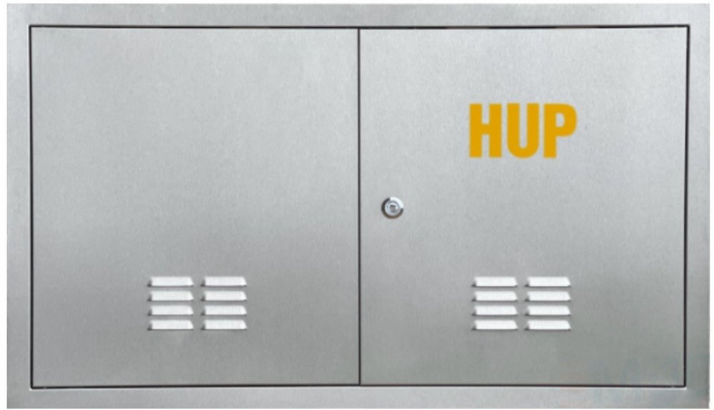 Revizní dvířka na plyn (HUP) a rám jsou vyrobeny z nerezového plechu. Rám z jednoho kusu precizně zpracován – ohyb i na vnější obvodové straně 5 mm zajišťuje pevnost a stabilitu. Na zadní straně rámu příprava pro uchycení do zdiva v podobě oválných a kruhových výseků, hloubka rámu 45 mm, šíře rámu 24 mm. Dvířka mají protidešťové žaluziové průduchy široké 60 mm ve dvou sloupcích a pěti řadách (odvětrávací žebra) ve spodní části. Ke dvířkům jsou také vyráběny shodná revizní dvířka bez děr pro odvětrání, vhodná například pro elektroměr nebo zakrytí technických šachet.
