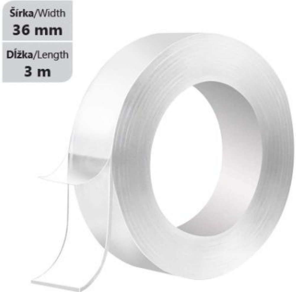 Multifunkční oboustranná Nano průhledná páska. Lepicí páska je odnímatelná a znovu použitelná beze stopy po nalepení. Páska je omyvatelná, má silnou přilnavost a dlouhotrvající živnost. Návod: 1. Odřízněte správnou velikost, kterou potřebujete 2. Odlepte ochrannou fólii pásky 3. Nalepte na místo, kde ji potřebujete 4. Chcete-li ji odlepit a znovu použít -z myjte zbytky povrchu pásky, po vysušení je možné ji znovu použít Ideální povrchy pro lepní: plast, kov, dřevo, sklo, cihle, keramika, kámen a další. Nevhodné povrhy pro lepení: nátěry na stěnách, omítka, drsný povrch, mastný povrch