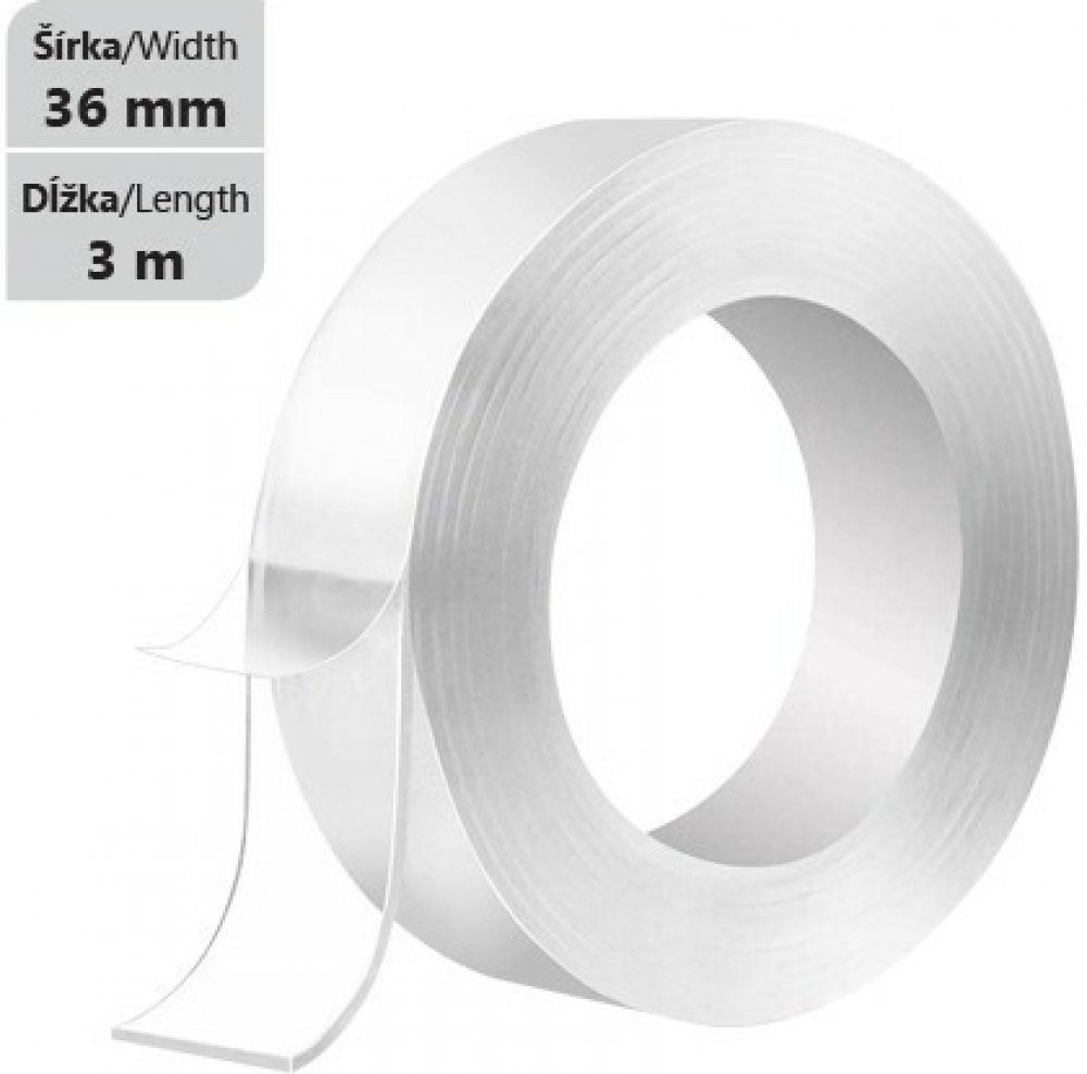 Multifunkční oboustranná Nano průhledná páska. Lepicí páska je odnímatelná a znovu použitelná beze stopy po nalepení. Páska je omyvatelná, má silnou přilnavost a dlouhotrvající živnost. Návod: 1. Odřízněte správnou velikost, kterou potřebujete 2. Odlepte ochrannou fólii pásky 3. Nalepte na místo, kde ji potřebujete 4. Pokud ji chcete odlepit a znovu použít - smyjte zbytky povrchu pásky, po vysušení je možné ji znovu použít. Ideální povrchy pro lepení: plast, kov, dřevo, sklo, cihle, ker